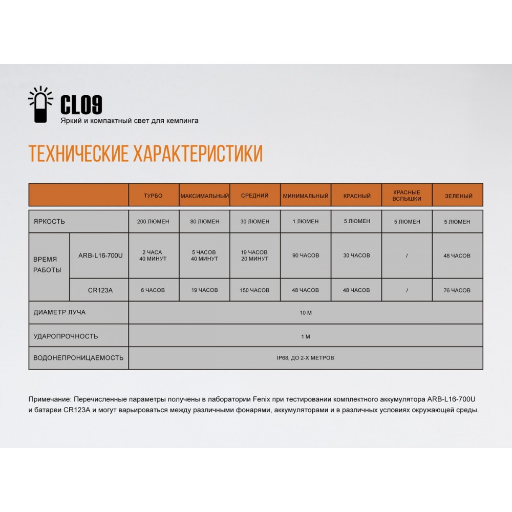 Второй вариант для данного фонаря &mdash это литиевая батарейка CR123A. Она идентична аккумулятору по размерам, но гораздо эффективнее работает в холоде. С этой батарейкой Fenix CL09 вполне можно использовать и в морозную погоду. Энергии одной стандартной батарейки хватит на 6-150 часов работы.