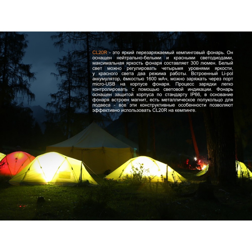 Перечисленные особенности делают модель Fenix CL20R отлично приспособленной для освещения не только в кемпинге, но и на рыбалке, на пикнике, а также во многих других ситуациях. Этот прочный и выносливый по отношению к различным погодным условиям фонарь, станет действительно нужной частью походного снаряжения.