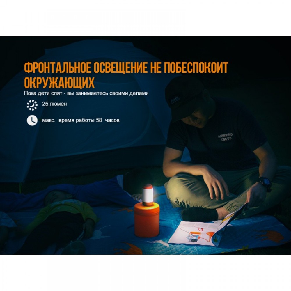 Чтобы во время отдыха за городом с палаткой в любое время суток иметь качественное освещение, стоит взять с собою в поездку кемпинговый фонарь Fenix CL26R. Это качественная современная модель с несколькими светодиодами белого и красного света. Фонарь предлагает своему владельцу 8 режимов освещения с максимальной яркостью вплоть до 400 люмен. Этого достаточно, чтобы освещать участок территории диаметром до 25 м. Причем, пользователь сам выбирает, будет ли фонарик светить сразу во все стороны или только в одну. Также предусмотрено два режима, когда фонарь светит вниз и два режима неяркого красного света. В комплекте с данной моделью продается фирменный долговечный аккумулятор 18650 емкостью 2600 мАч. Именно на основе его характеристик составлены описания для всех режимов освещения, которые производители получили в ходе лабораторных испытаний. Но также допускается использование аккумуляторов другой емкости и батареек CR123A. Этот тип батареек известен стойкостью к низким температурам, что позволяет ему не увеличивать уровень саморазрядки на морозе.