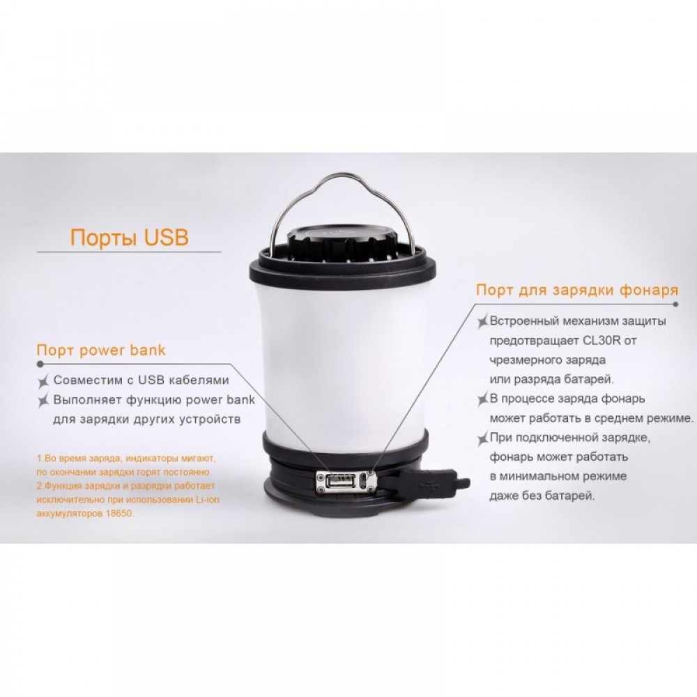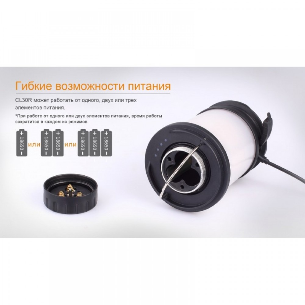 Для работы фонаря CL30R потребуются аккумуляторы размера 18650. Полный набор включает три элемента питания, но если окажется необходимым, данная модель в состоянии работать и на одном или двух аккумуляторах. В этом случае длительность работы фонаря уменьшится. Производители также привели данные о времени автономной работы CL30R при использовании фирменных аккумуляторов на 2600 мАч и на 3400 мАч. Для режима Turbo это 4 с половиной и 6 часов, для режима High &mdash 9 и 12 часов, для режима Mid &mdash 38 и 51 час, для режимов Low и Flash &mdash 70 и 93 часа, для режима Eco &mdash 300 и 400 часов. Таким образом, емкость и качество элементов питания напрямую влияет на период автономной работы кемпингового фонаря.