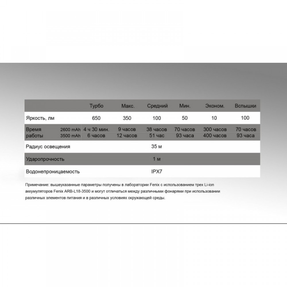 Комплектация | Светильник, уплотительное кольцо, микро-USB кабель, АКБ 18650 ARB-L18-2600 (2600 мАч) – 3 шт. |