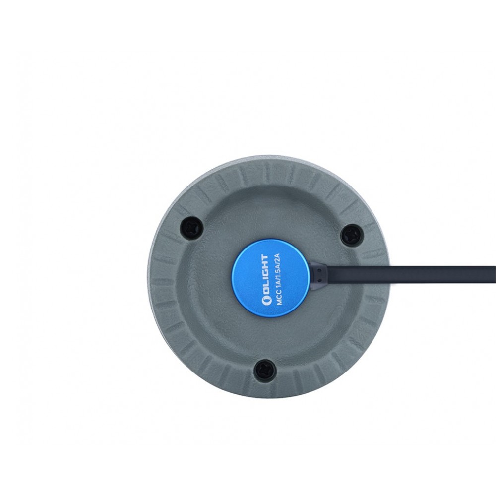 - Подсоедините магнитный коннектор к нижней части фонаря Olight Olantern, зарядное устройство отцентрируется автоматически. Индикатор загорится красным во время зарядки. Когда зарядка полностью завершится, индикатор загорится зеленым. Нормальное время зарядки составляет около 7 часов. Рекомендуемое напряжение/ток: 5V/2A.