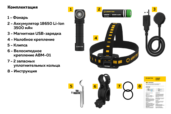 В комплект входит комфортное налобное крепление, клипса для фиксации на одежде или рюкзаке и велокрепление ABM-01. Wizard C2 Pro совместим с креплением на каску AHM-02 и подходит для строительных работ.