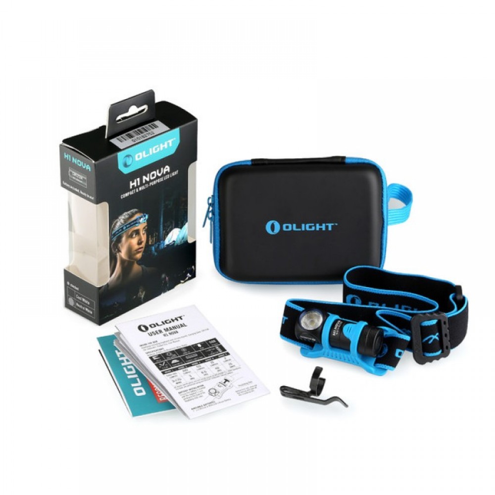 Комплектация: фонарь Olight H1 Nova, налобное эластичное крепление, коробка для хранения Olight, клипса на ремень, батарейка CR123A, инструкция на русском языке (см. фото).