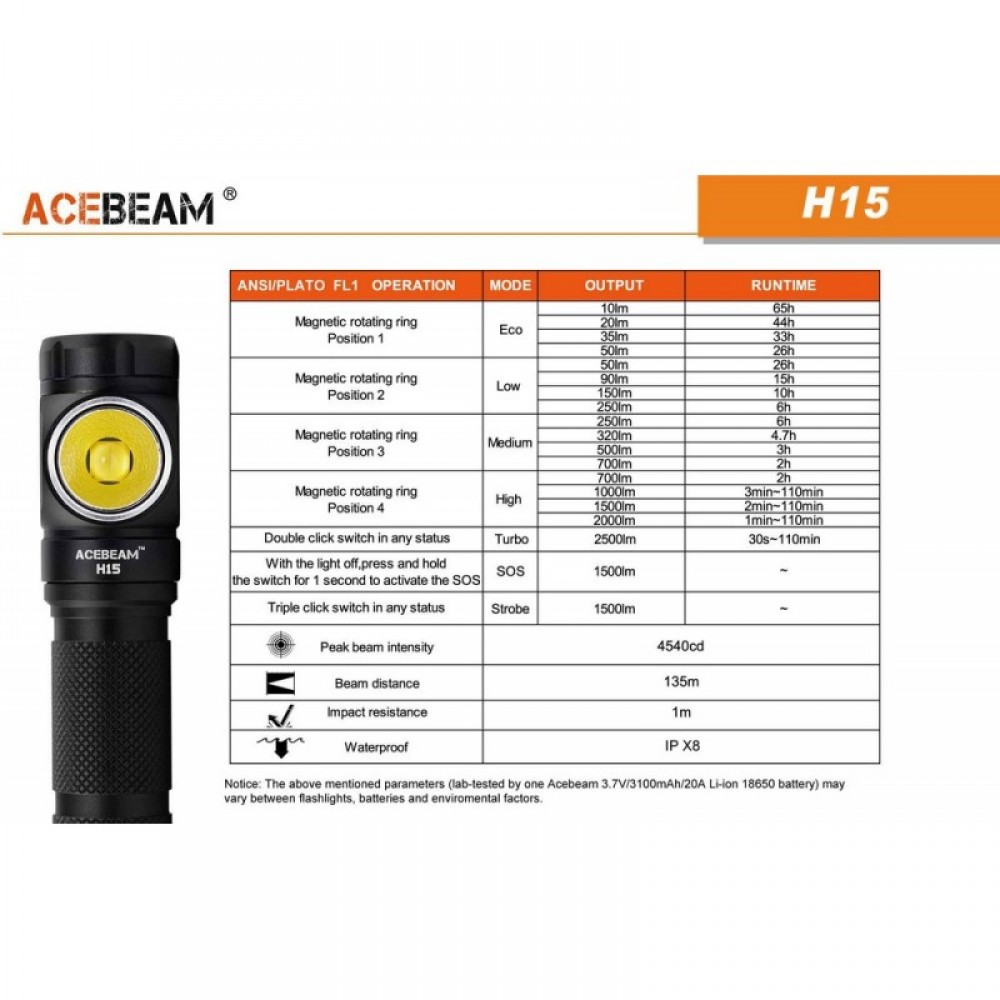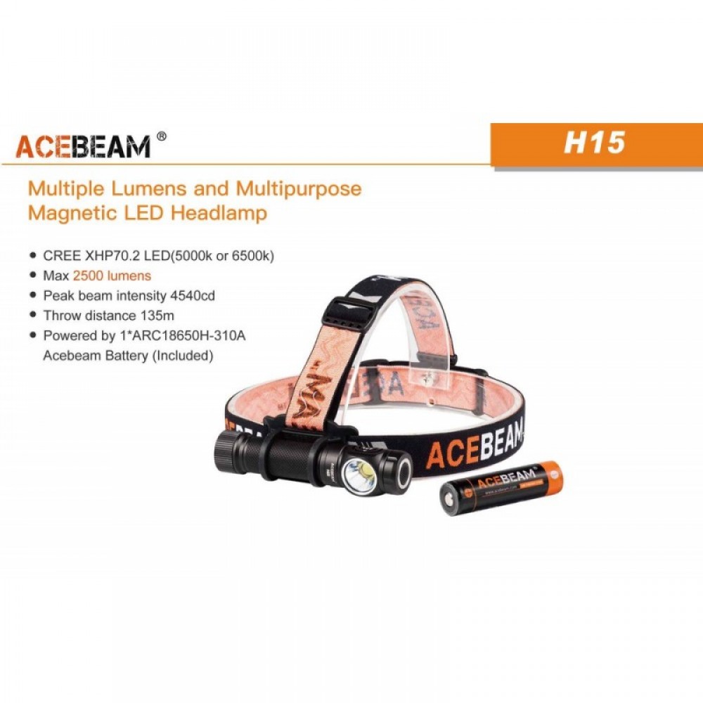 Высококачественный налобный мульти фонарь высокой мощности "Г"-образного типа AceBeam H15от компании AceBeam (Эйсбим) на новом светодиоде Cree XH-P 70.2 в сверхпрочном и водонепроницаемом корпусе мощностью 2500 люмен. При своем малом размере и весе, фонарь дает отличную яркость центрального пятна и приятную равномерную засветку. H15 поставляет с высокотоковым LI-ion аккумулятором 18650 IMR 3100 мАч. Огромное количество режимов яркости за счет управления кнопкой и дополнительным магнитным кольцом в голове фонаря, которое переключает 2-ю линию режимов, а кнопкой производится включение и смена основных режимов.