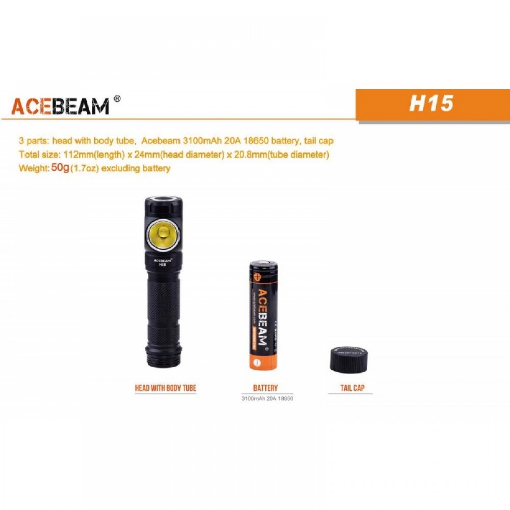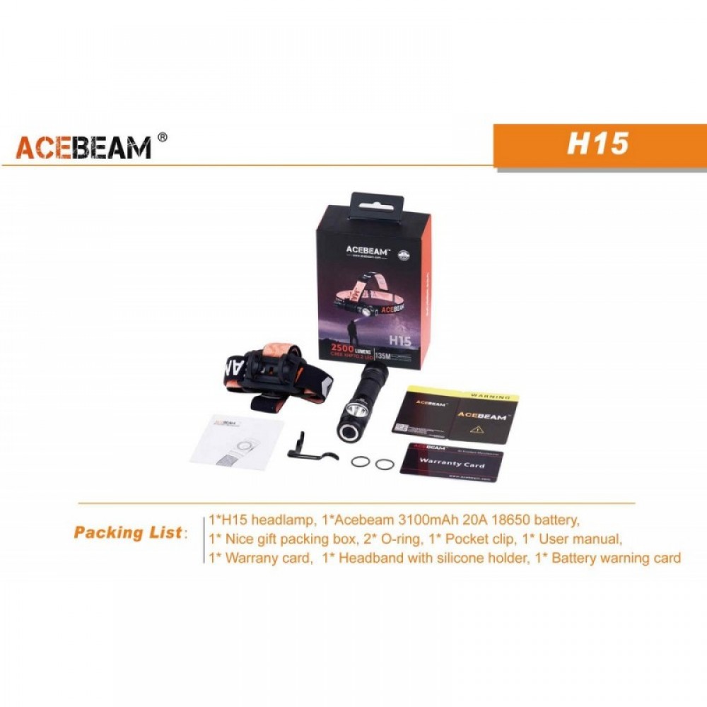 Комплектация: фонарь Acebeam H15, аккумулятор 18650 3100 мАч, налобное крепление, силиконовый держатель, запасные резиновые кольца (2шт), съемная клипса.