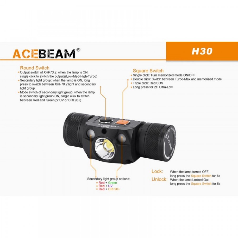 - Acebeam H30-CRI CW - диод Cree XH-P 70.2 CW Холодный белый (≈6500К) + Nichia 219C с повышенной цветопередачей CRI 90+