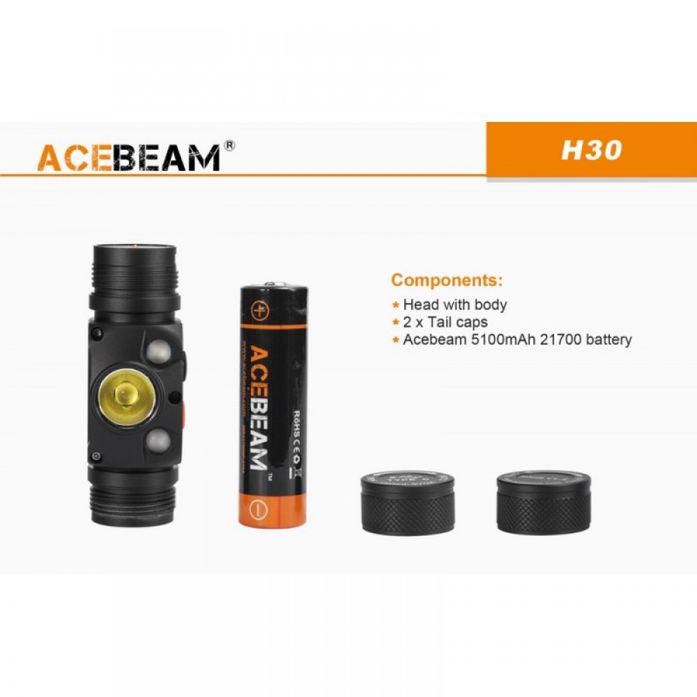 Комплектация | Фонарь Acebeam H30, Налобное крепление Acebeam, Кабель Acebeam USB Type-C, Аккумулятор Acebeam 21700 5100 мАч, Запасные уплотнительные кольца 2 шт, Гарантийный талон, Инструкция |