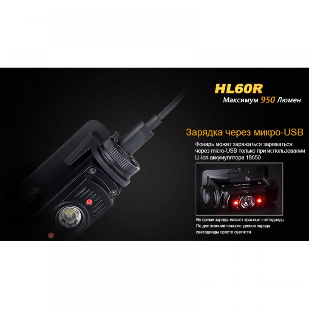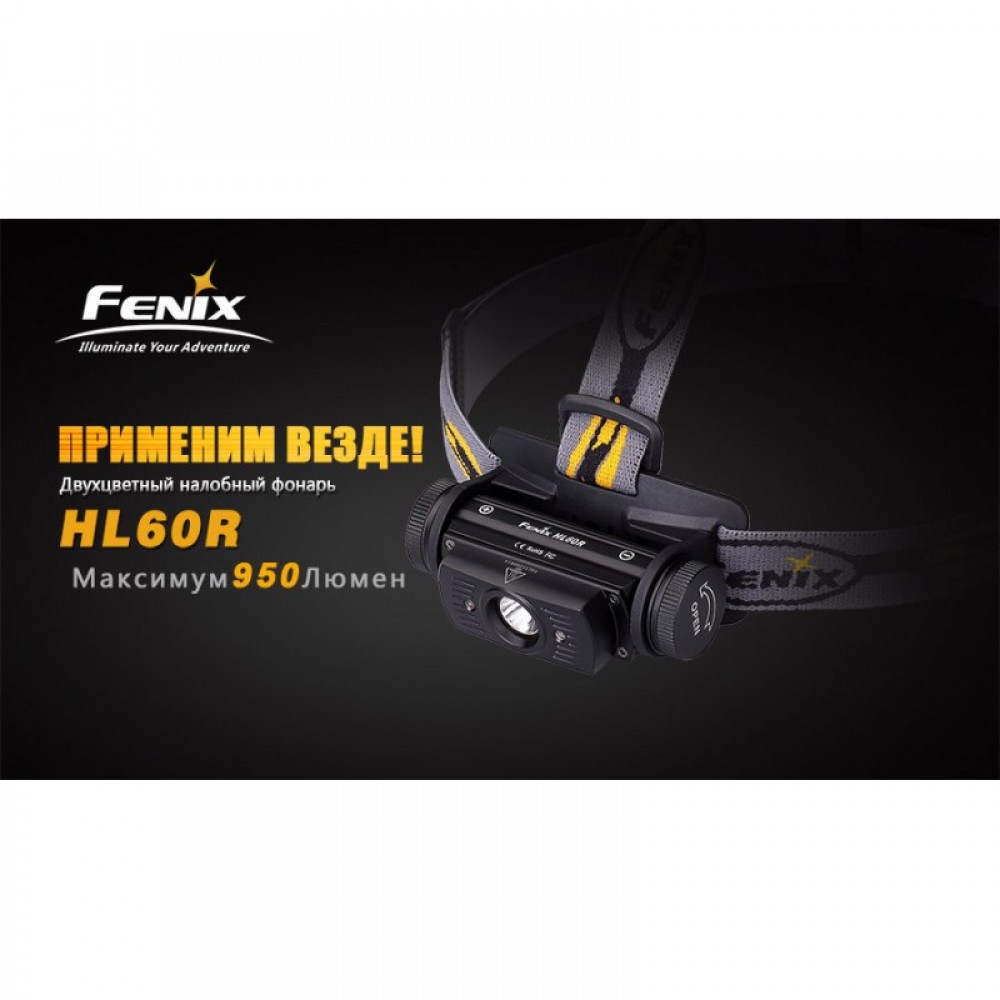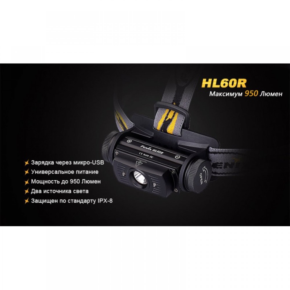 Налобный фонарик Fenix HL60R располагает основным диодом Cree серии XM-L2 U2, который выдает нейтрально белый луч, и двумя дополнительными диодами красного цвета. Благодаря ним, фонарь способен светить в шести популярных режимах, пять из которых приходятся на основной диод. Максимальная яркость этого фонаря декларирована на уровне 950 люмен. Его луч довольно широкий, с хорошей радиальной засветкой, а вдаль он освещает территорию на 166 метров. В комплект к фонарю прилагается фирменный аккумулятор с возможностью накапливать 2600 мАч заряда. Данные о яркости и продолжительности работы фонаря даны с учетом использования именно этого аккумулятора.