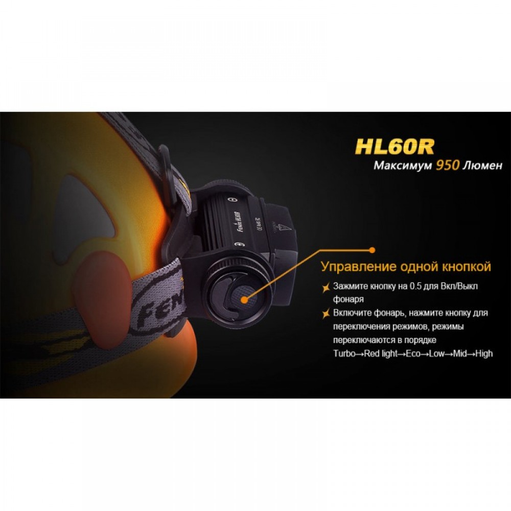 Инструкции по использованию: Модель Fenix HL60R использует для работы аккумулятор 18650 или две литиевые одноразовые батарейки, которые не имеют возможность повторной зарядки, форматаCR123A. Кнопка для управления фонариком расположена на боковой поверхности корпуса. Нажмите на нее 0,5 секунды, чтобы включить его или выключить. Переключение режимов осуществляется в таком порядке: Turbo→Red light→Eco→Low→Mid→High. Причем режимы яркости вносятся в память фонаря, чтобы последний из них включился во время следующего сеанса работы с фонарем.