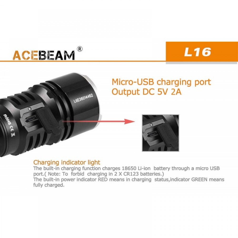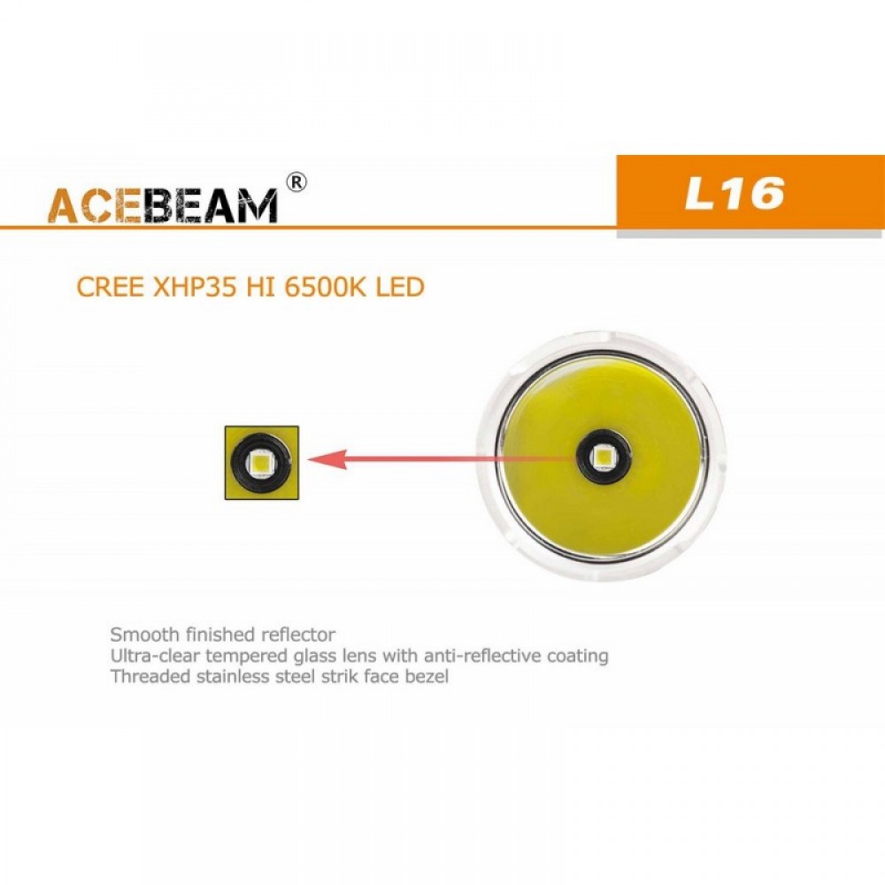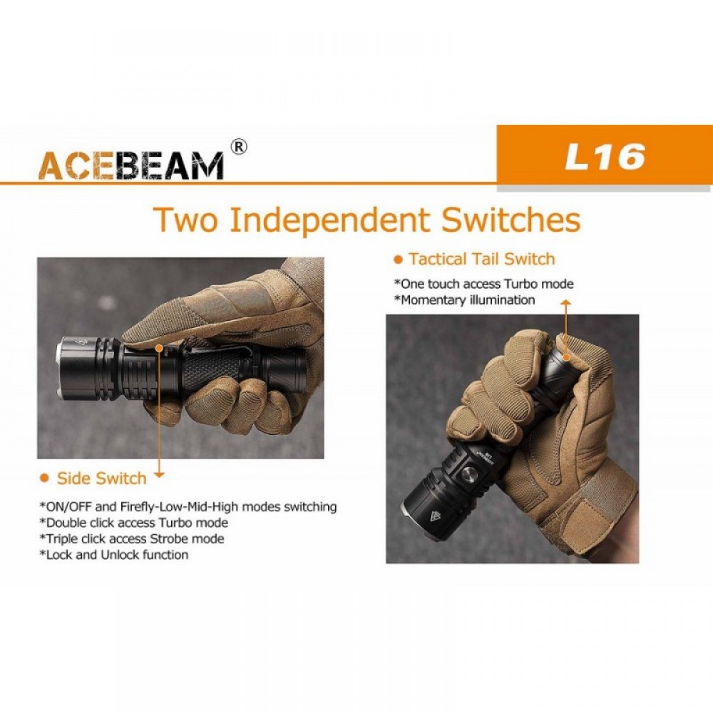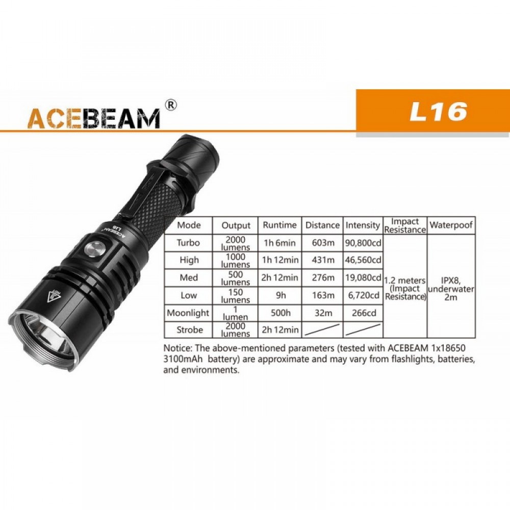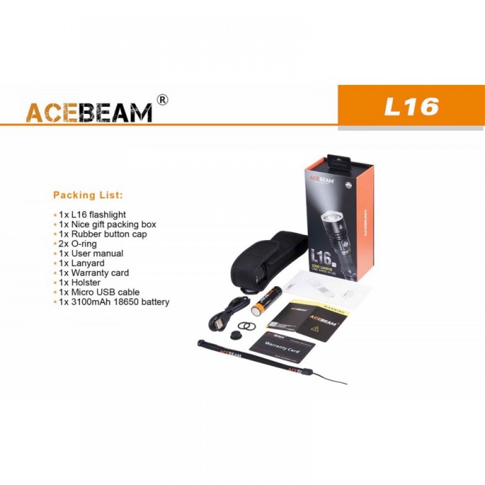 Тактический подствольный фонарь AceBeam L16(Эйсбим) на светодиоде Cree XH-P 35 HI, выдающий 2000 люмен от аккумулятора типоразмера 18650 (li-ion). Мощность светового потока регулируется кнопкой, расположенной на крышке фонаря. В фонарь установили глубокий гладкий рефлектор, благодаря чему, свет стал более узкий и сфокусированный, что позволило увеличить дальнобойность фонаря до 603 метра. В комплект поставки входит зарядное устройство от порта micro-USB и Li-ion аккумулятор Acebeam 18650 емкостью 3100 мАч, который обеспечивает 500 часов работы в минимальном режиме.