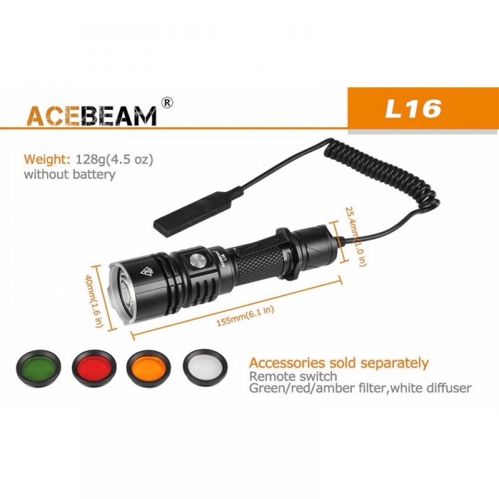 Тактическая дистанционная выносная кнопка AceBeam ARPS-R05 (приобретается отдельно) позволит использовать L16 как подствольный фонарь на охоте, а так же цветные светофильтры AceBeam FR30 (приобретается отдельно), применяется в ночное время суток для сохранения сумеречного зрения и для наблюдения за животными, т.к. они имеют черно белое зрение.