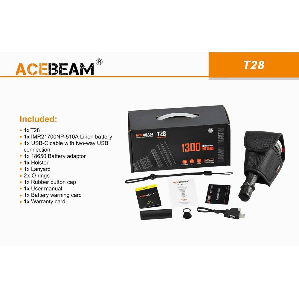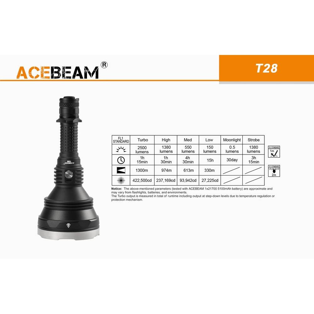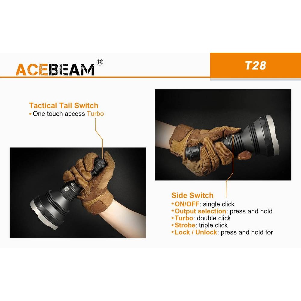 В фонарь установили глубокий гладкий рефлектор, благодаря чему, свет узкий равномерный с хорошей боковой засветкой. Тактическая дистанционная выносная кнопка Acebeam ARPS-R02 (приобретается отдельно) позволит использовать T28 как подствольный фонарь на охоте, идеально подойдет для стрельбы из нарезного оружия типа карабин с оптическим прицелом на дальние дистанции. В фонаре T28 установлен управляющий драйвер с интеллектуальной системой контроля внутренней температуры и функцией цифровой стабилизации яркости на всех режимах работы в зависимости от температуры окружающей среды, при чрезмерном нагреве фонаря автоматически снизит яркость до безопасного уровня.