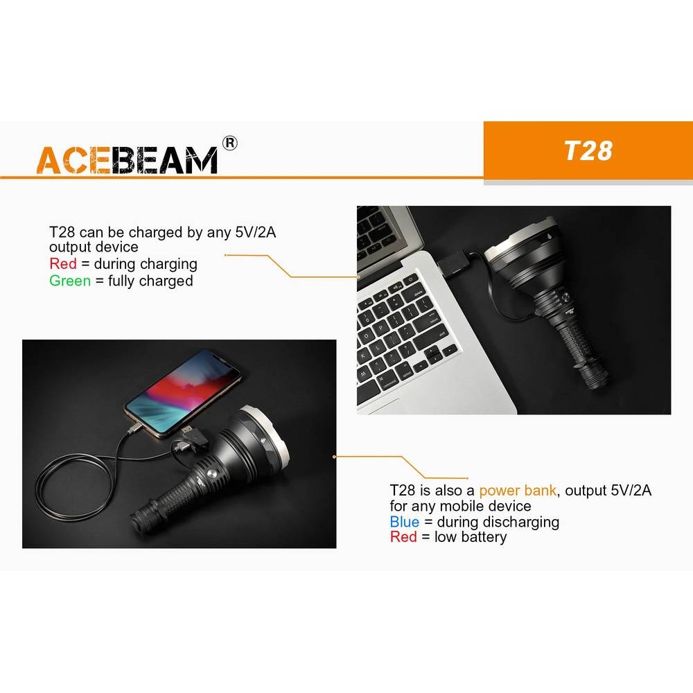 Acebeam T28 обладает функцией POWERBANK - зарядки внешних устройств от USB выхода, работая через провод USB. Таким способом вы можете зарядить севший на природе или в поездке телефон и GPS навигатор, если под рукой нет сети 220 В.