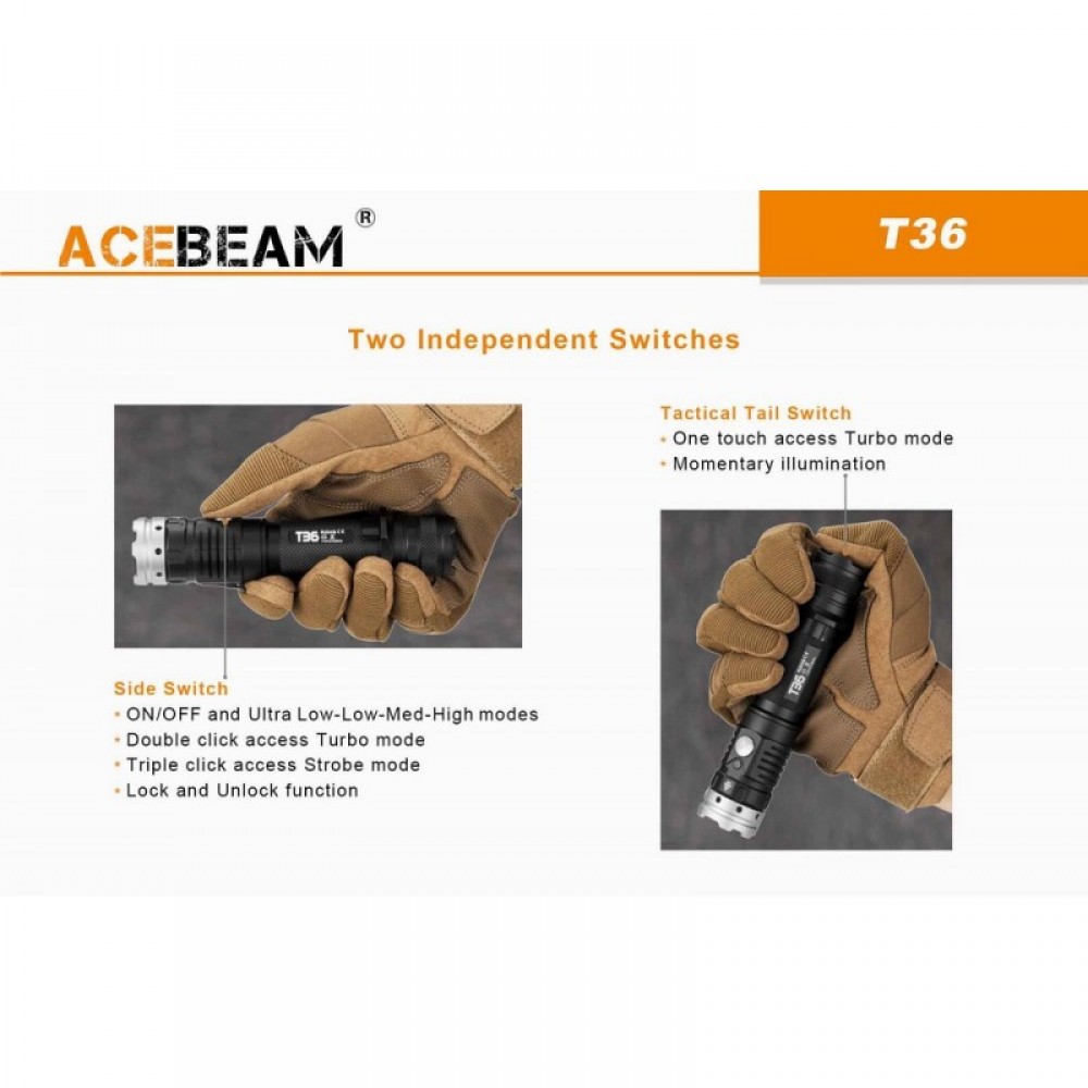 Тактическая дистанционная выносная кнопка Acebeam ARPS-R02 (приобретается отдельно) позволяет использовать T36 как подствольный фонарь на оружии для ночной охоты, а так же цветные светофильтры AceBeam FR50 (приобретается отдельно), применяется в ночное время суток для сохранения сумеречного зрения и для наблюдения за животными, т.к. они имеют черно белое зрение. Цветовая индикация уровня заряда аккумуляторов позволяет узнать о необходимости зарядки фонаря.