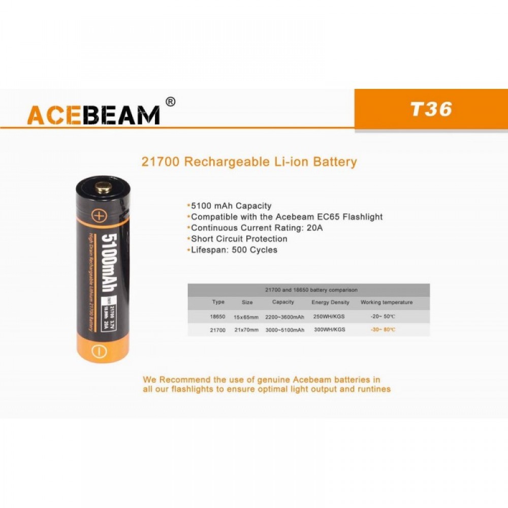 Тактический подствольный фонарь AceBeam T36 (Эйсбим) на светодиоде Cree XH-P 35 HI, выдающий 2000 люмен и дальность светового потока 303 метра. В комплект поставки входит высокоскоростное зарядное устройство от порта USB Type-C и новый формат Li-ion аккумулятор Acebeam 21700 емкостью 5100 мАч, который обеспечивает более 90 часов работы в минимальном режиме. Новый формат аккумулятора 21700 очень популярный, он имеет ряд преимуществ перед аккумулятором 18650, к которому все уже привыкли. Он имеет энергетическую емкость 300 Ватт на 1 кг батареи, а 18650 все го лишь 250 Ватт на 1 кг, так же он способен работать при критических температурах от -30 до +80, в отличии от 18650, который работает от -20 до +50 градусов по Цельсию.