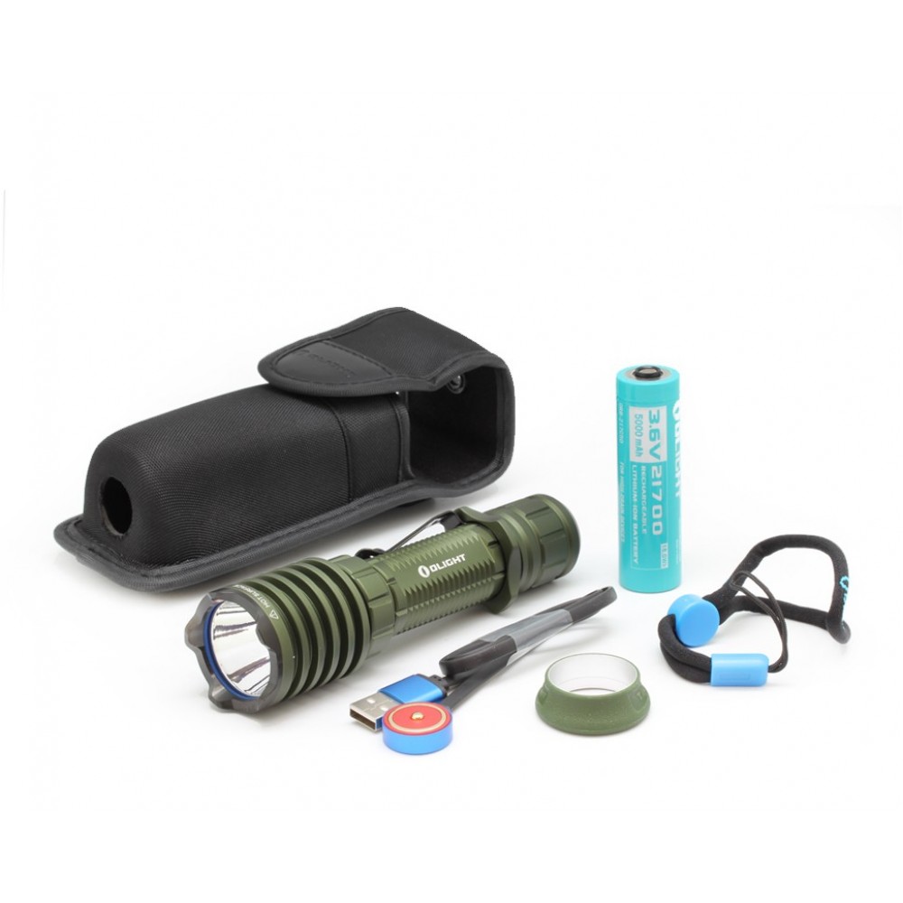 Комплектация: Фонарь Olight Warrior X Pro, аккумулятор Li-ion 21700 Olight ORB-217C50 5000 mAh, зарядное магнитное USB устройство Olight MCC3 Magnetic, чехол Olight, клипса, резиновый грипп упор, упаковка.