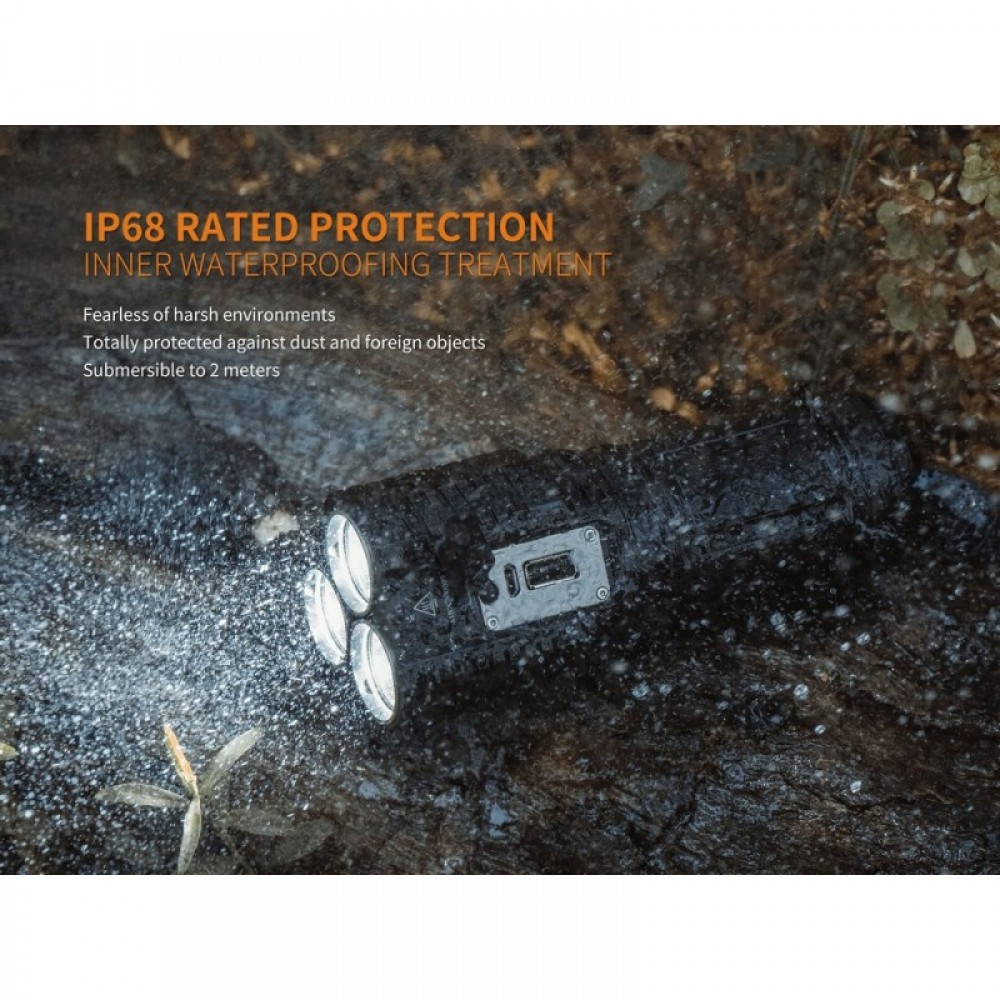 Материалом для изготовления корпуса был выбран авиационный алюминий. Он стоек к механическим нагрузкам и не поддается коррозии. А анодирование по стандарту HAIII значительно повышает жесткость корпуса, делая его ещё более прочным. К тому же, Fenix TK72R полностью пыле- и водонепроницаем (IP68), что позволяет применять его в любую погоду.