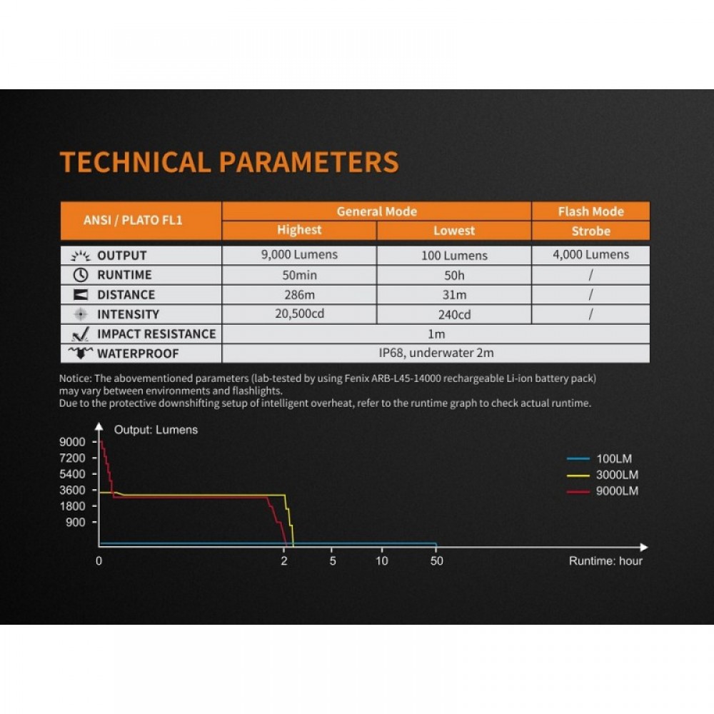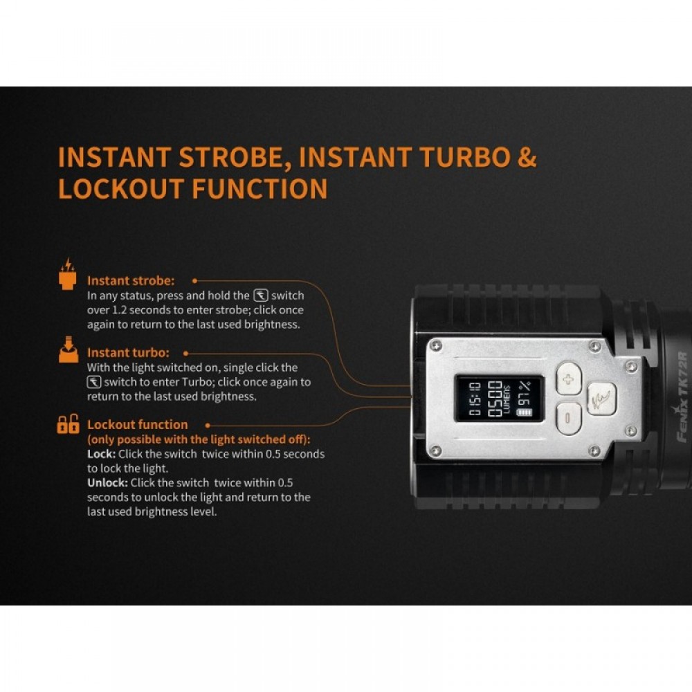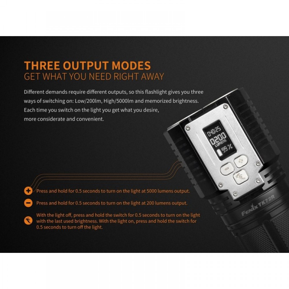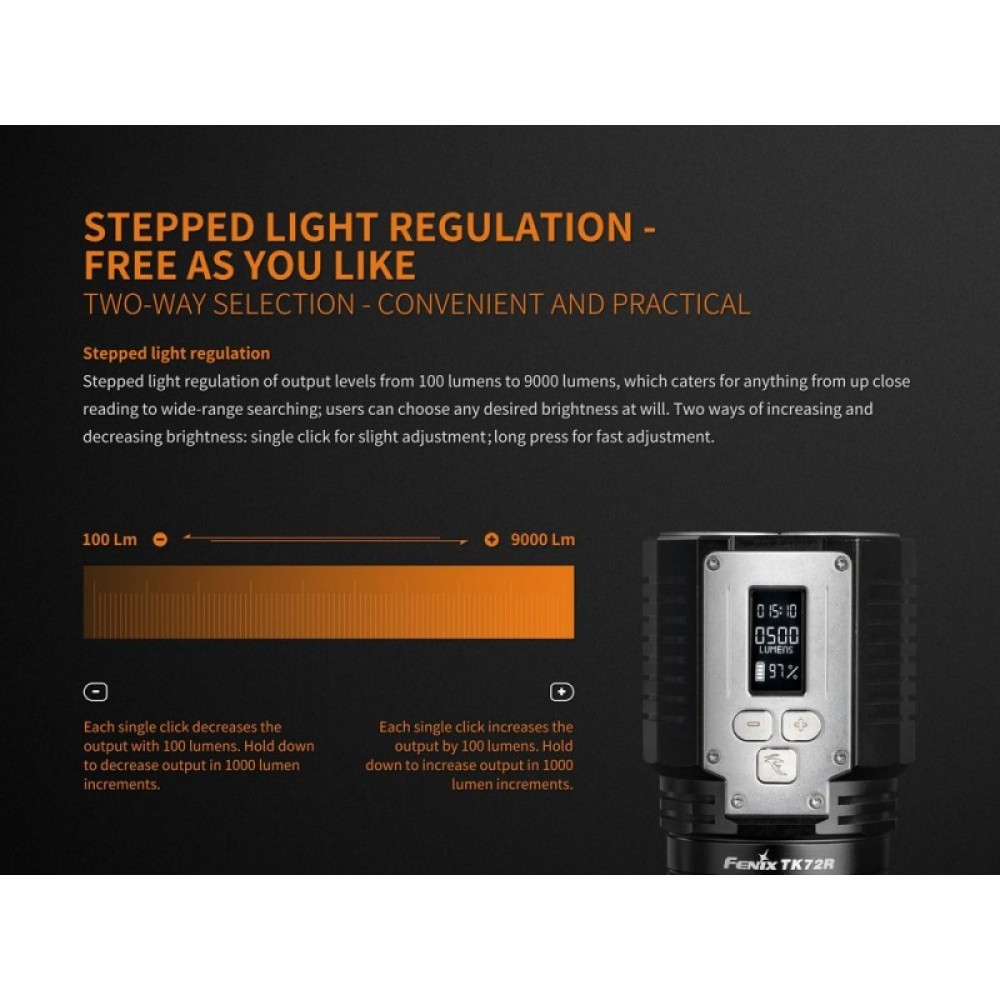 Представленный фонарь способен работать с яркостью от 100 до 9 000 люмен. При включении TK72R, пользователь может собственноручно контролировать мощность фонаря в пределах вышеописанного диапазона с помощью клавиш «+» и «-», что позволяет подобрать наиболее подходящий уровень освещения для каждой конкретной ситуации. Fenix TK72R также может работать в режиме стробоскопа с яркостью 4 000 люмен (реализован быстрый доступ к этому режиму).