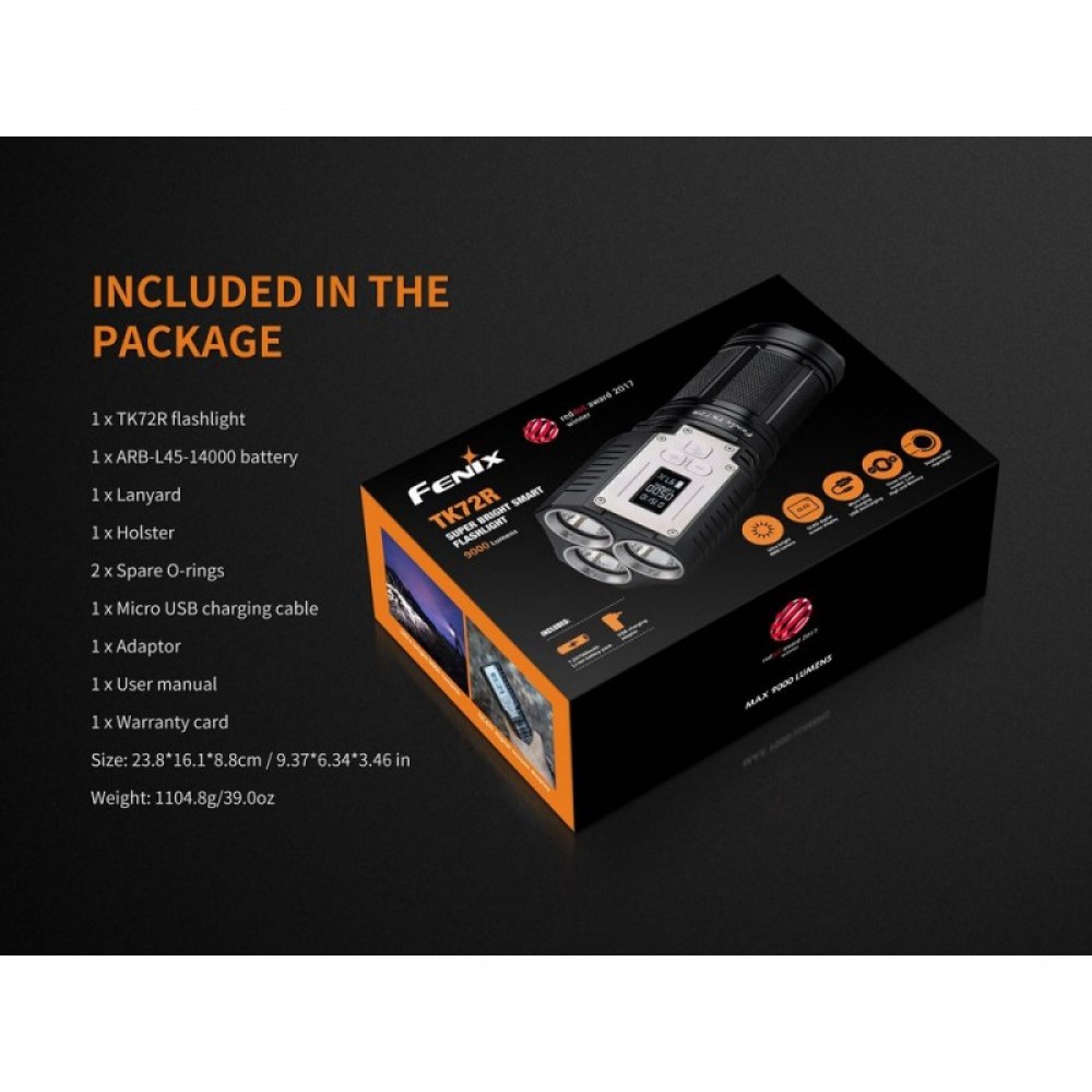 Фонарь Fenix TK72R предоставляется вместе с аккумулятором, страховочным темляком, фирменным нейлоновым чехлом, парой запасных уплотнительных колец и USB кабелем для зарядки.