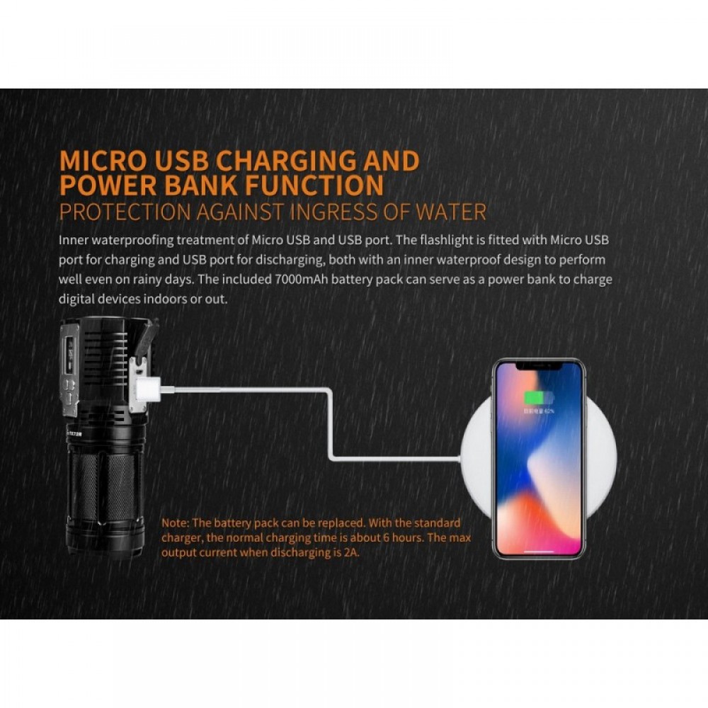 Питание фонаря осуществляется от встроенного литий-ионного аккумулятора с емкостью 7 000 мАч и напряжением 7.2 В. Его можно зарядить не вынимая из фонаря через micro USB порт от бытовой сети 220В или Power-bank`a.