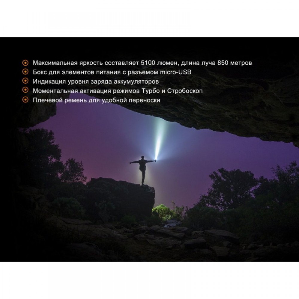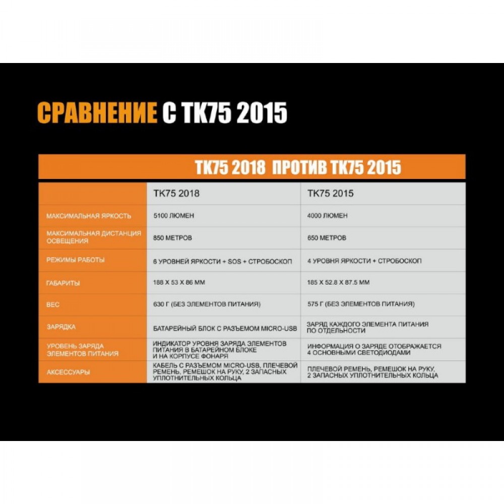 Комплектация: Мощный фонарьTK75 2018, кабель micro-USB для зарядки, плечевой ремень, темляк, 2 запасных уплотнительных кольца, пластиковый футляр для хранения.