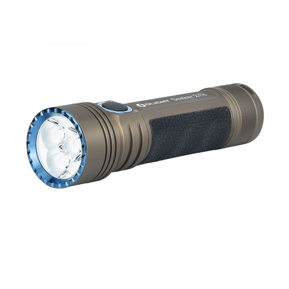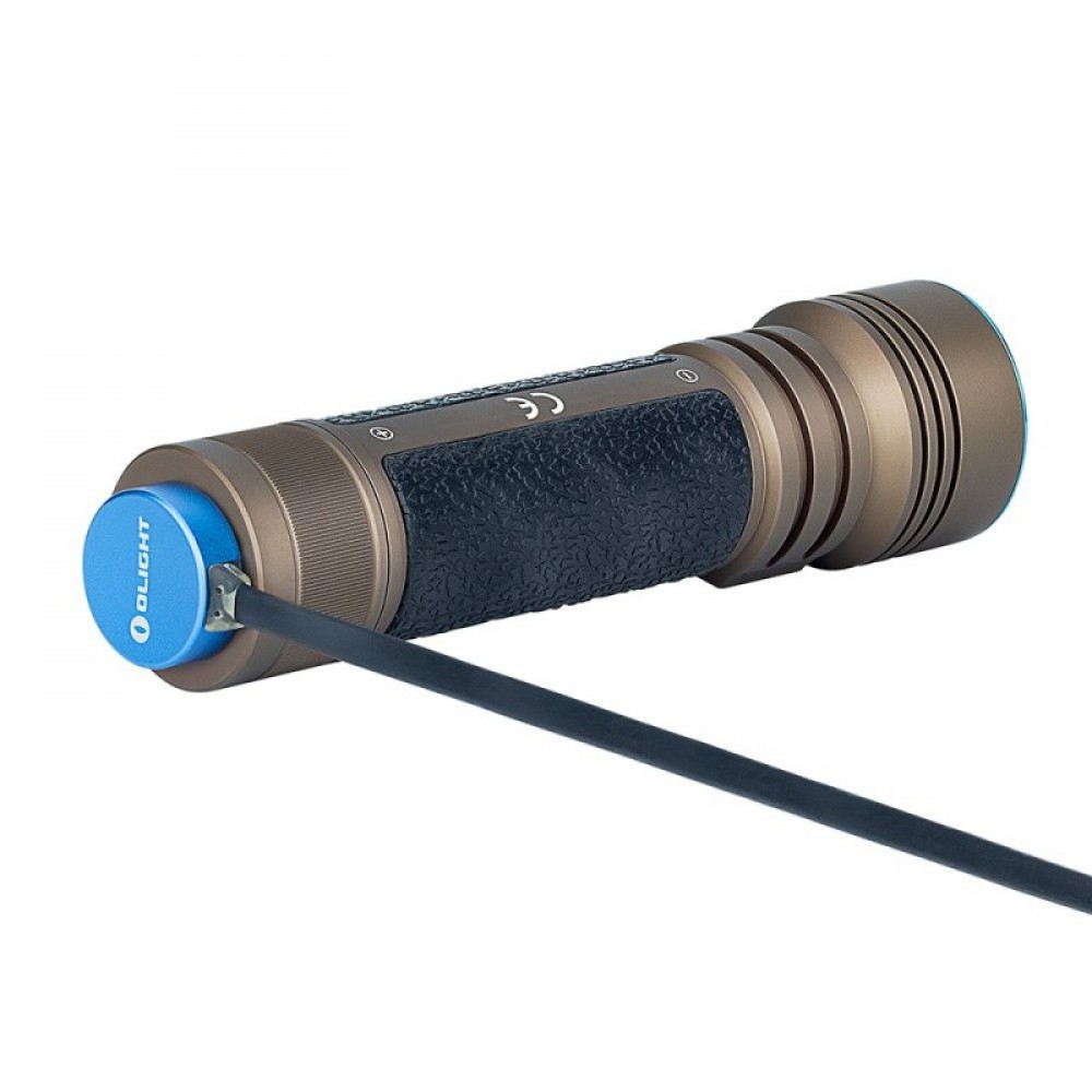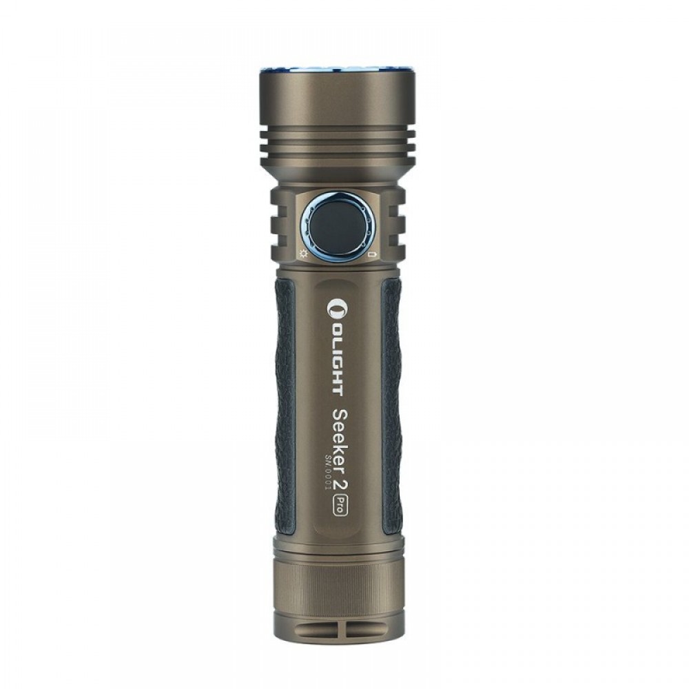 Перезаряжаемый светодиодный фонарь Olight Seeker 2 Pro Desert Tan на диоде трех светодиодах Cree XP-L HD CW мощностью 3200 люмен, дальнобойностью 250 метров. В комплект поставки входит кастомный li-ion аккумулятор 21700 фирмы Olight ORB-217P50 емкостью 5000 мАч и переносной магнитный USB кабель 1000 мА для подзарядки фонаря от адаптера 220 В.