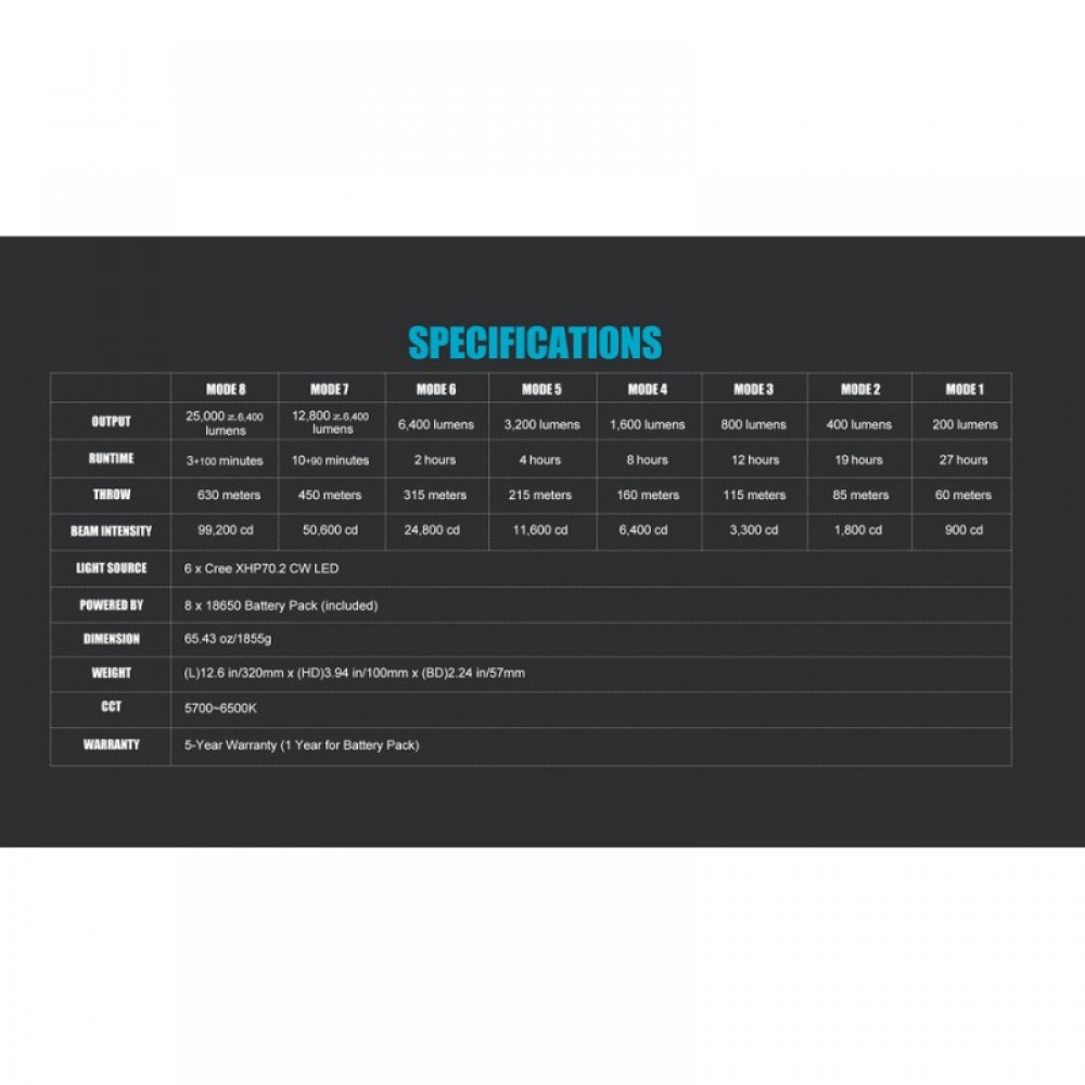 - Фонарь выдает в режиме Turbo 12800 люмен - необходимо дважды нажать на кнопку управления, Turbo S 25000 люмен - опять дважды нажать на кнопку.