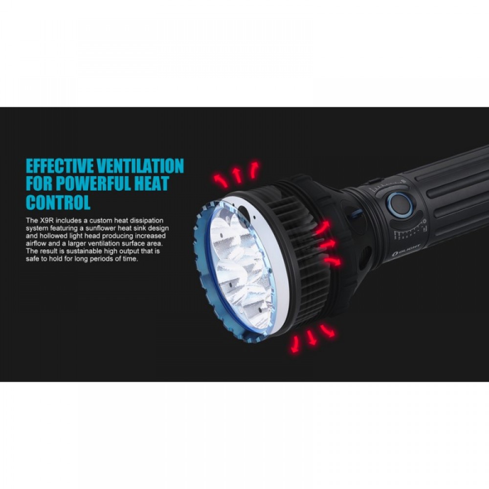Мощнейший поисковый фонарь Olight X9R Marauder (Олайт) на шести новых светодиодах Cree XH-P 70.2, мощность светового потока составляет феноменальные 25 000 люмен и дальность 630 метров. Фонарь питается от аккумуляторного блока, состоящего из 8 li-ion аккумуляторов 18650, емкость которого составляет 6000 мАч 14.4 В.
