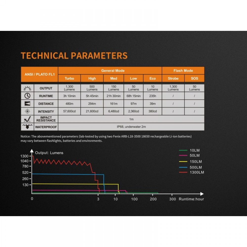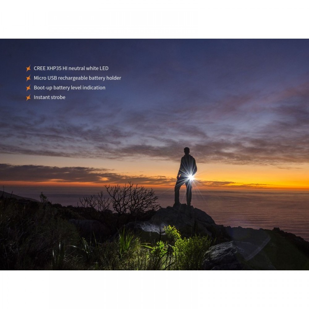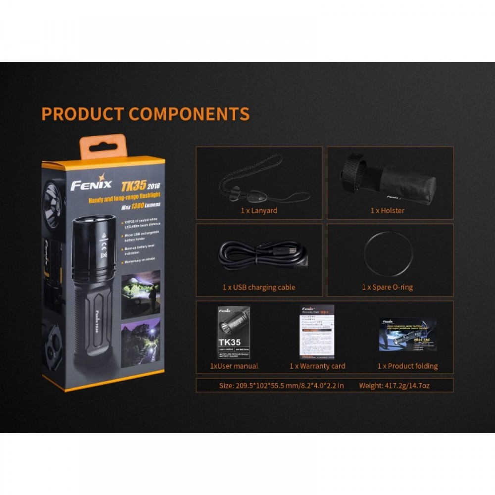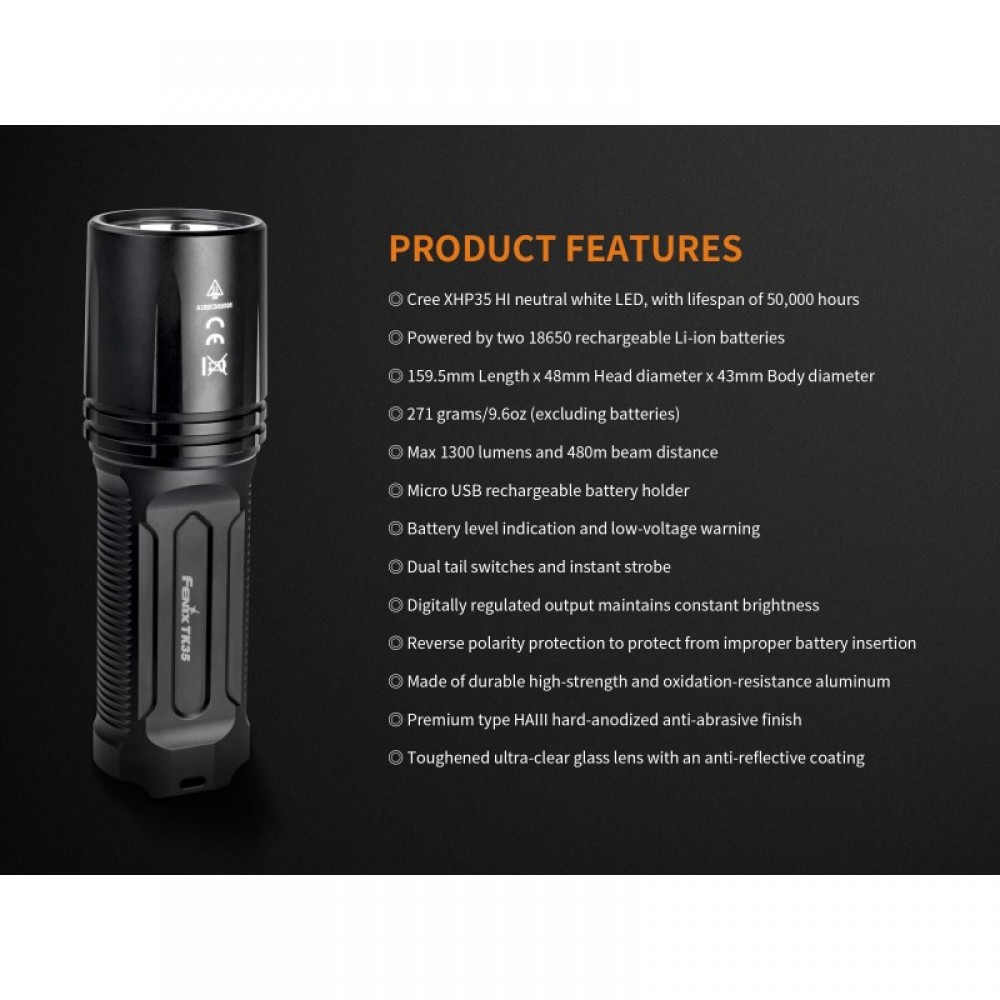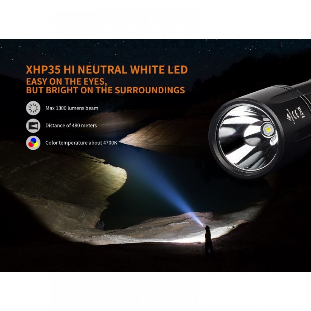 Для того чтобы фонарь соответствовал современным требованиям пользователей, производитель укомплектовал его самыми современными комплектующими из доступных на данный момент. Таким образом, модель Fenix TK35 (2018) получила светодиод Cree XHP35 HI, который в свою очередь способен создавать световой поток с яркостью до 1300 люмен, а дальность освещения при этом может достигать 480 метров.