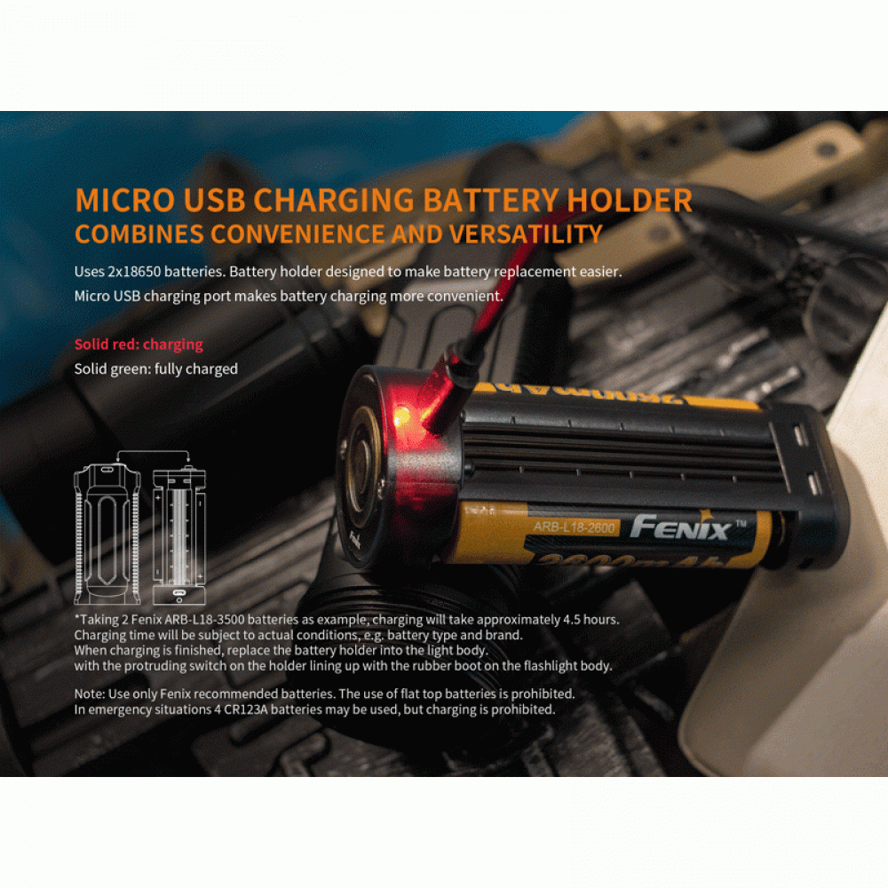 Питание фонаря осуществляется от двух литий-ионных аккумуляторов типоразмера 18650. Предварительно их необходимо установить в специальную «кассету». Одной из функций этой «кассеты» является возможность зарядки установленных элементов питания с помощью USB кабеля практически от любого совместимого источника питания. Возле micro-USB порта есть небольшой световой индикатор с помощью которого отображается прогресс зарядки.