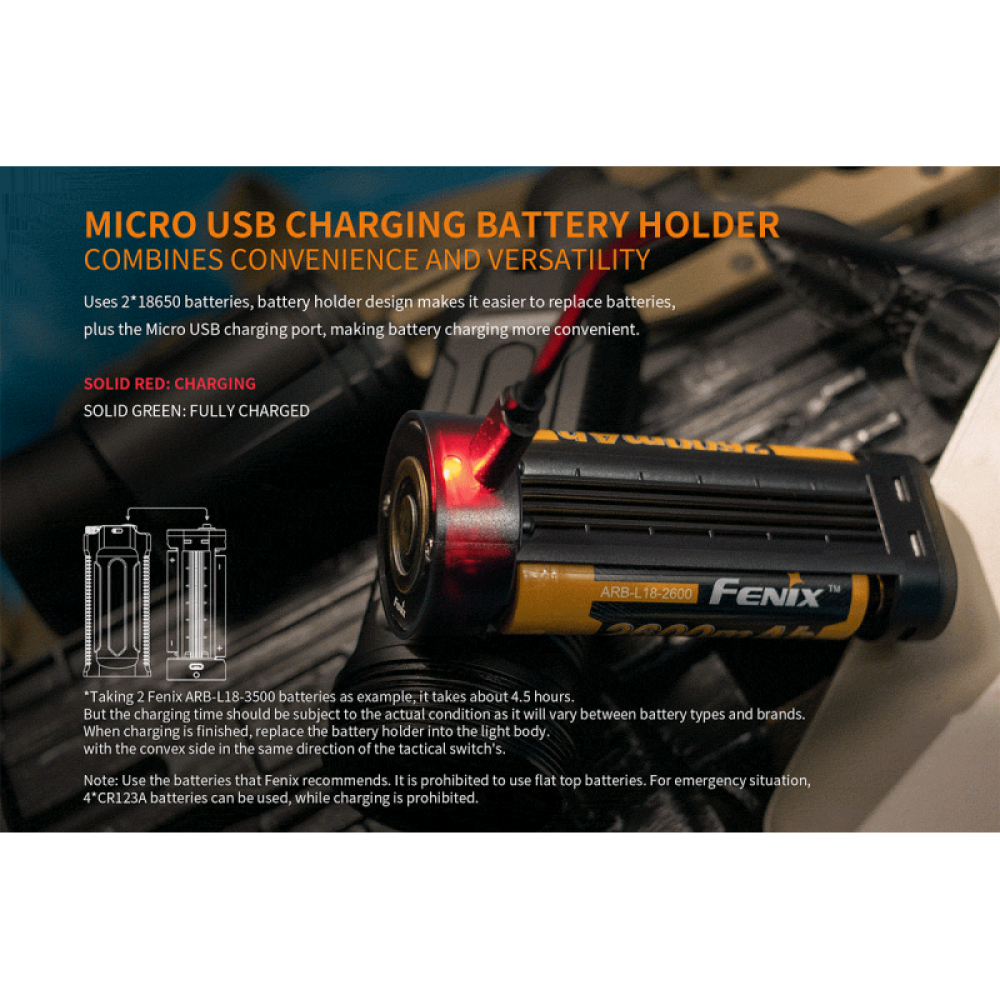 Ручная модель Fenix TK35UE 2018 работает на базе пары аккумуляторов 18650. Они устанавливаются в специальную пластиковую кассету параллельно друг другу. Эта кассета оснащена разъемом формата micro-USB, так что зарядить аккумуляторы можно от любого power-банка или совместимого источника энергии. Во время работы с фонарем пользователь может в любой момент проверить, каков текущий уровень заряда. Индикатор, встроенный в эту модель, отображает данные автоматически при включении света. Если индикатор будет непрерывно светиться зеленым, то аккумулятор полностью заряжен. Если лампочка буде мигать зеленым цветом, то уровень заряда достаточный. При постоянном свечении красным светом, индикатор указывает на низкий уровень заряда. Если красная лампочка мигает, уровень заряда аккумуляторов – критически низкий.