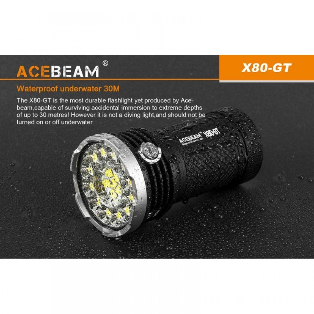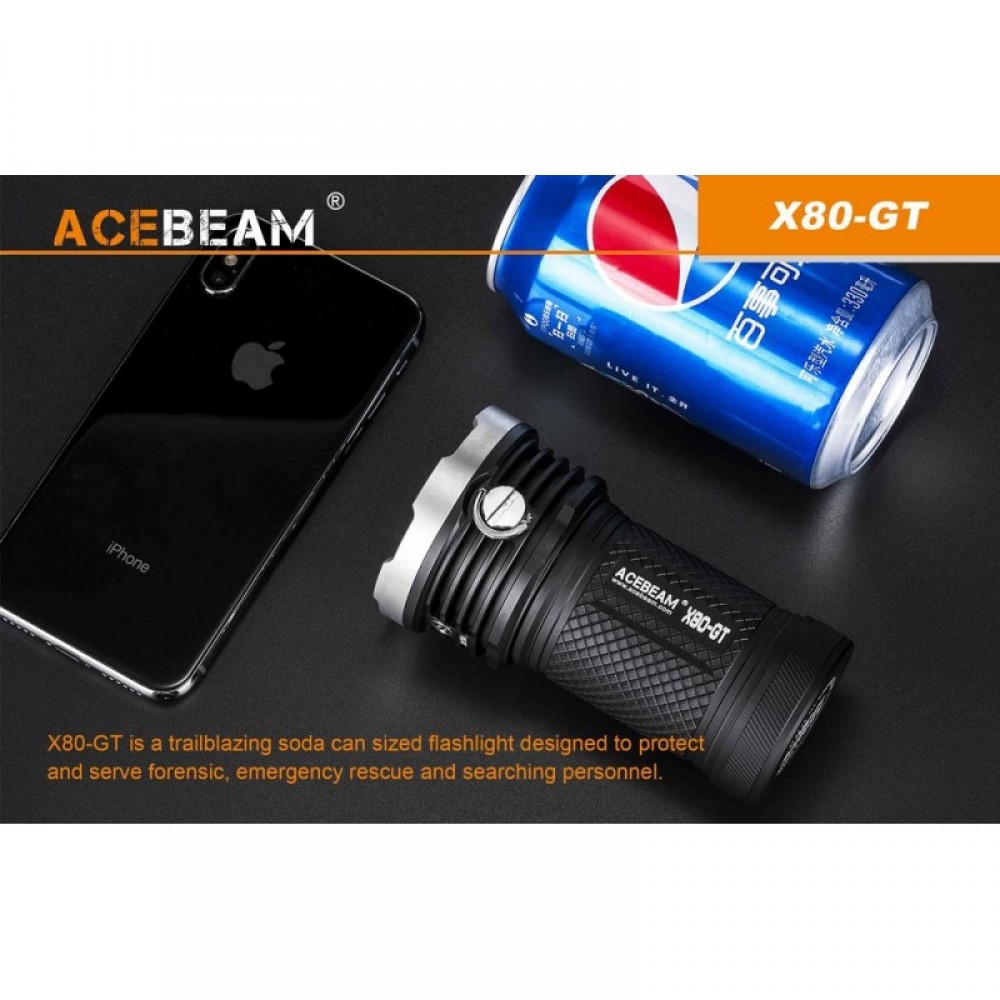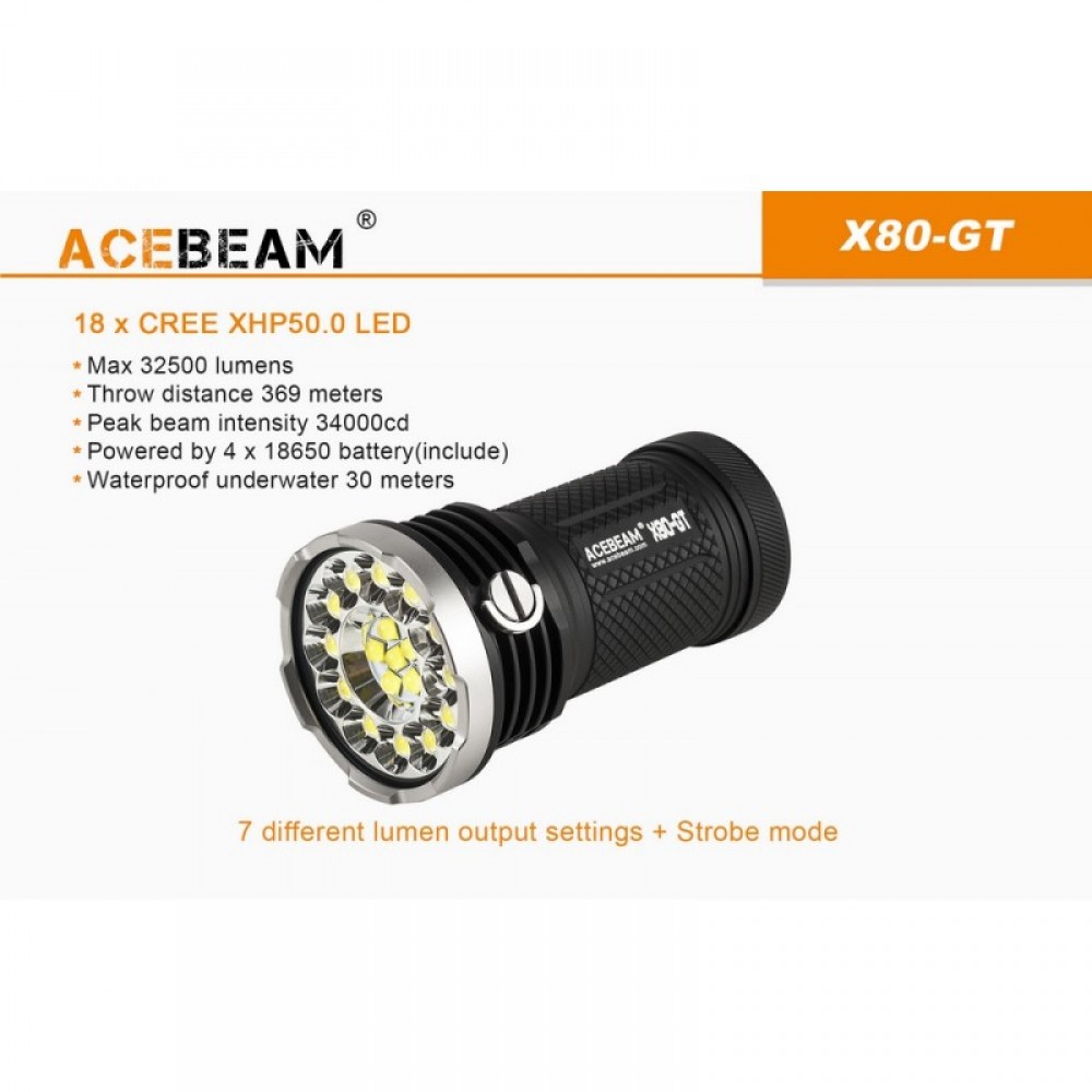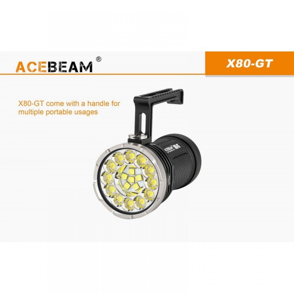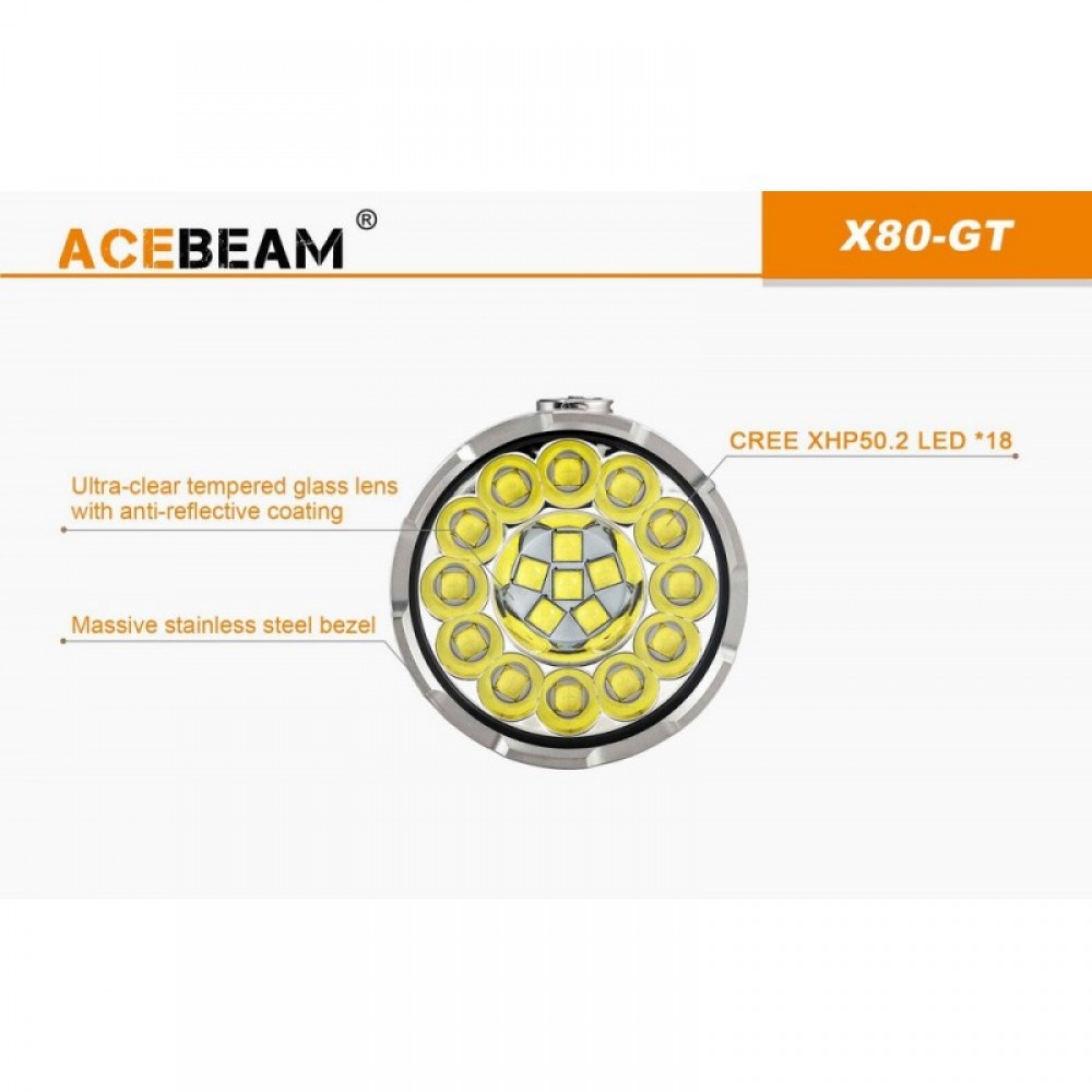 Самый мощный и компактный фонарь флагман AceBeam X80-GT в линейке компании AceBeam (Айсбим) на новых светодиодах XH-P 50.2 P2 американской фирмы Cree в количестве 18 штук, выдающий невероятные 32 500 люмен.