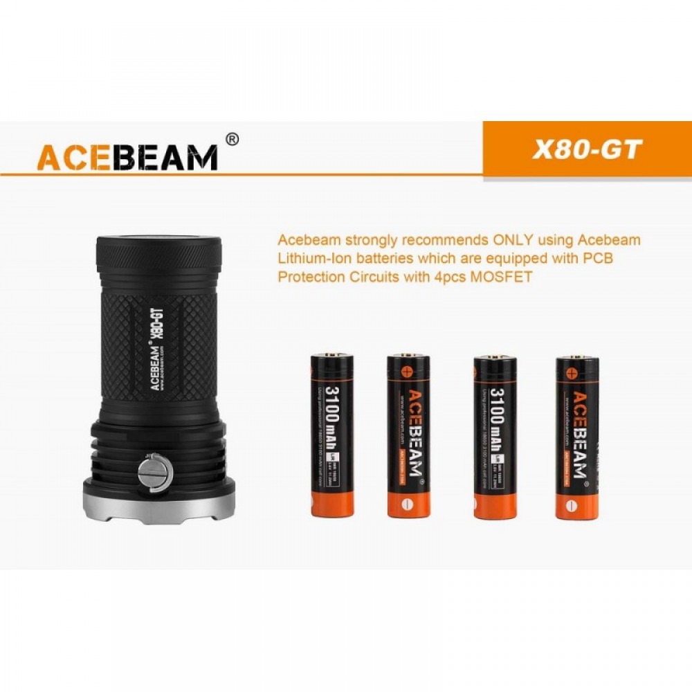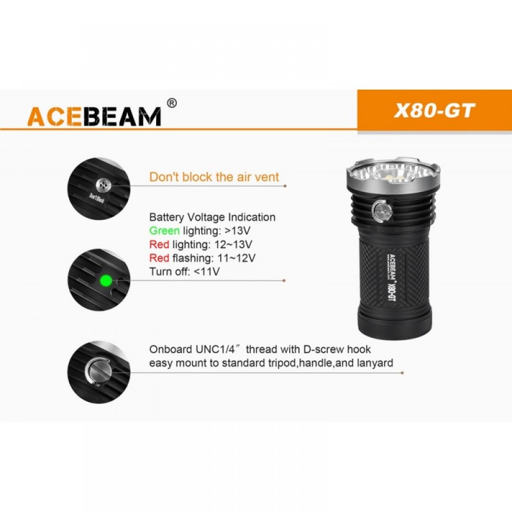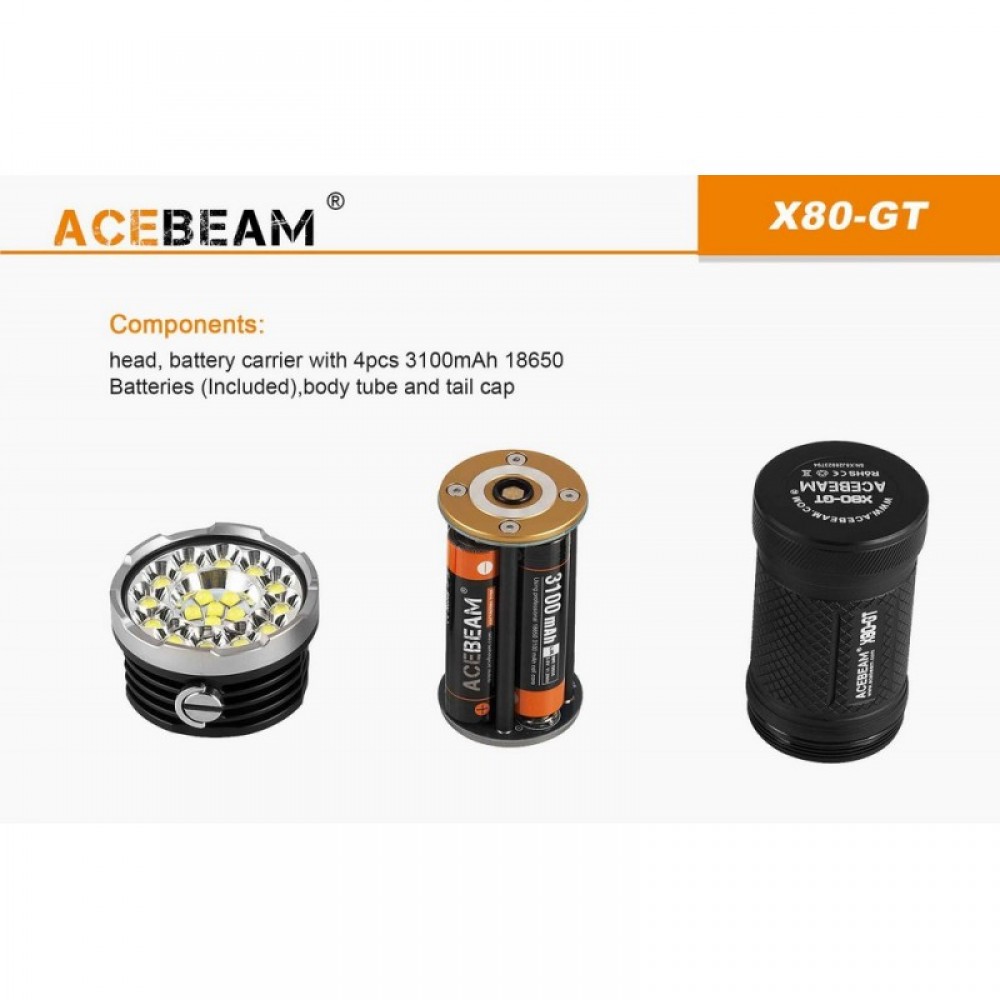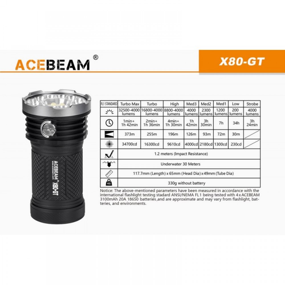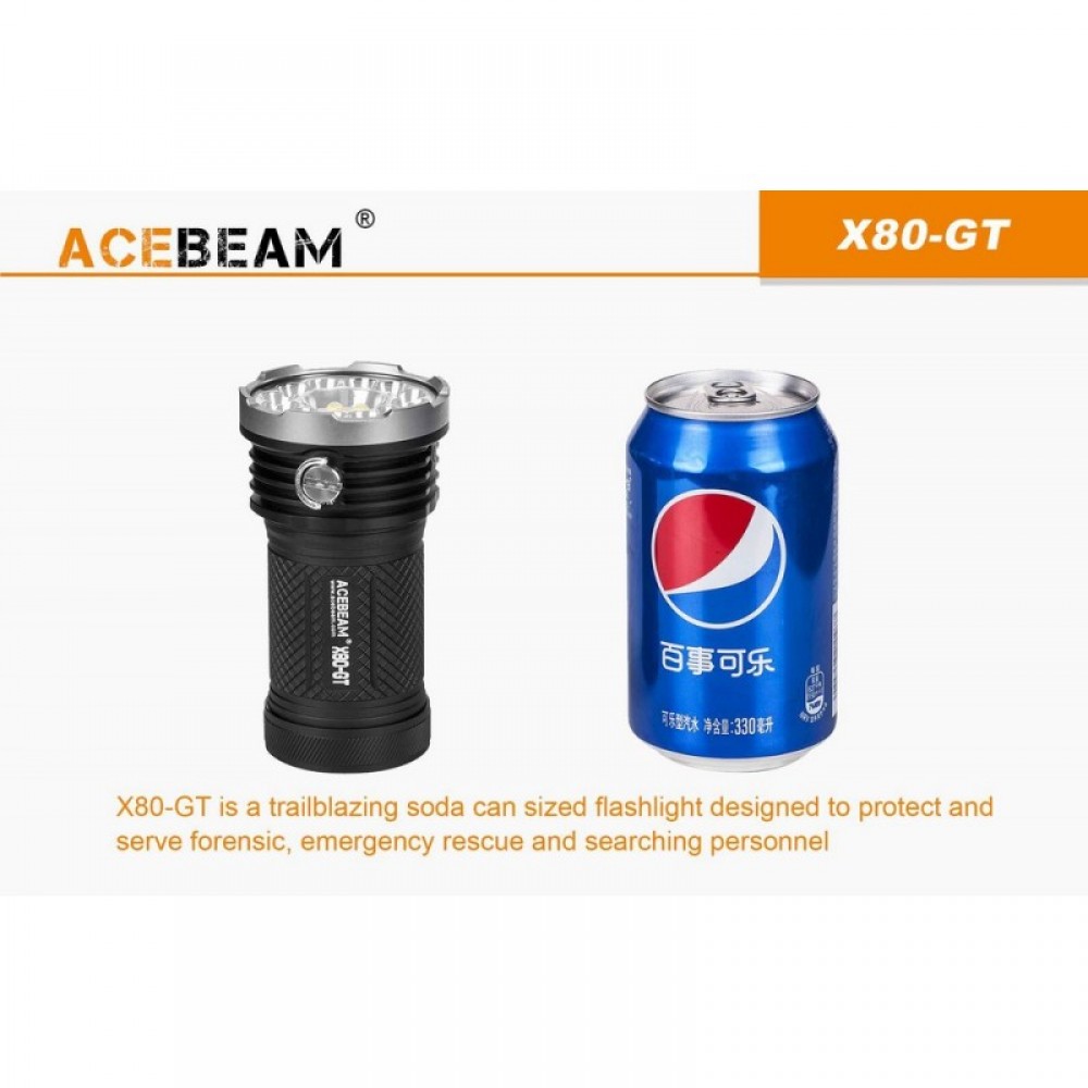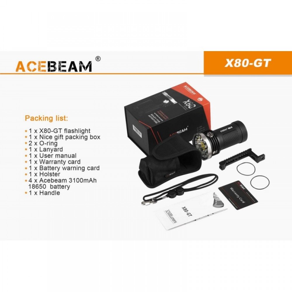 Самый мощный и компактный фонарь флагман AceBeam X80-GT в линейке компании AceBeam (Айсбим) на новых светодиодах XH-P 50.2 P2 американской фирмы Cree в количестве 18 штук, выдающий невероятные 32 500 люмен.