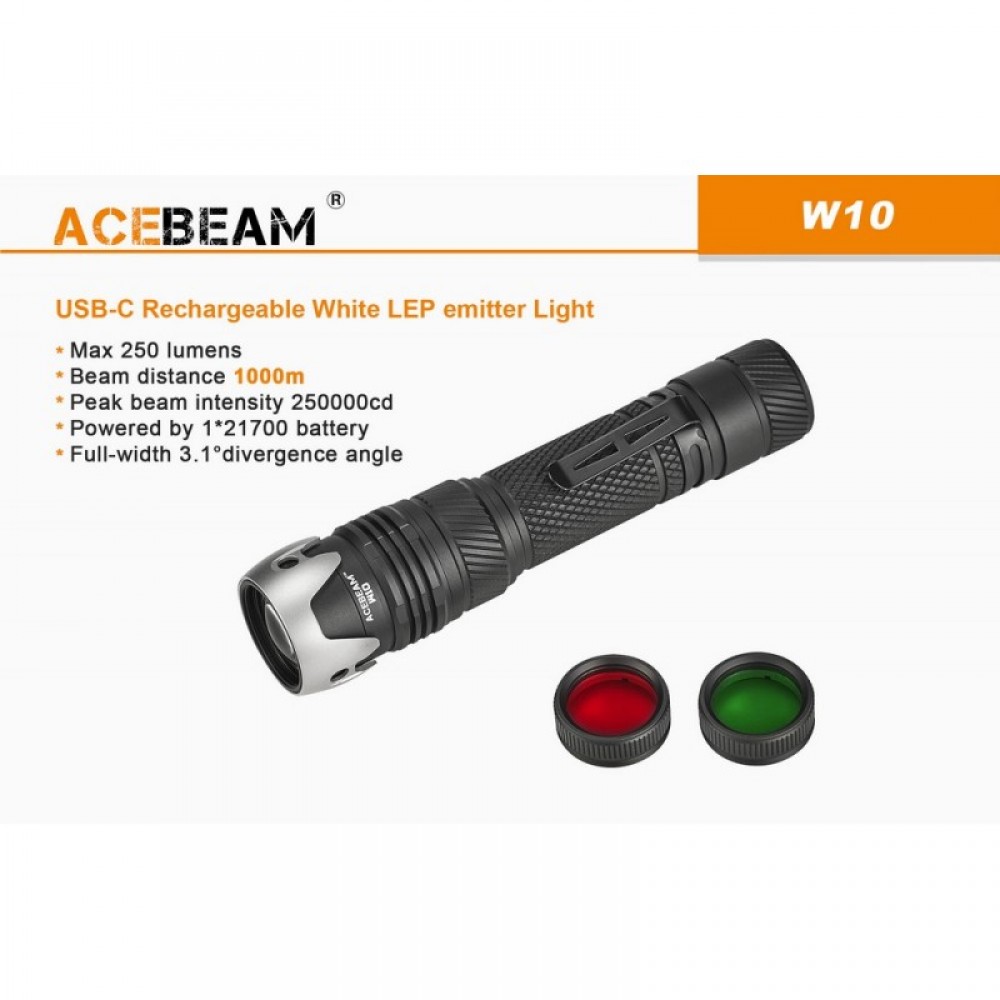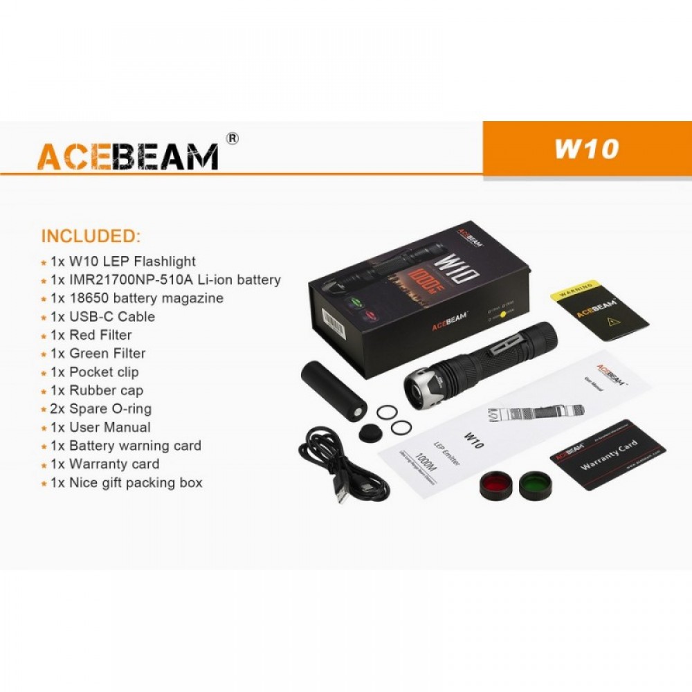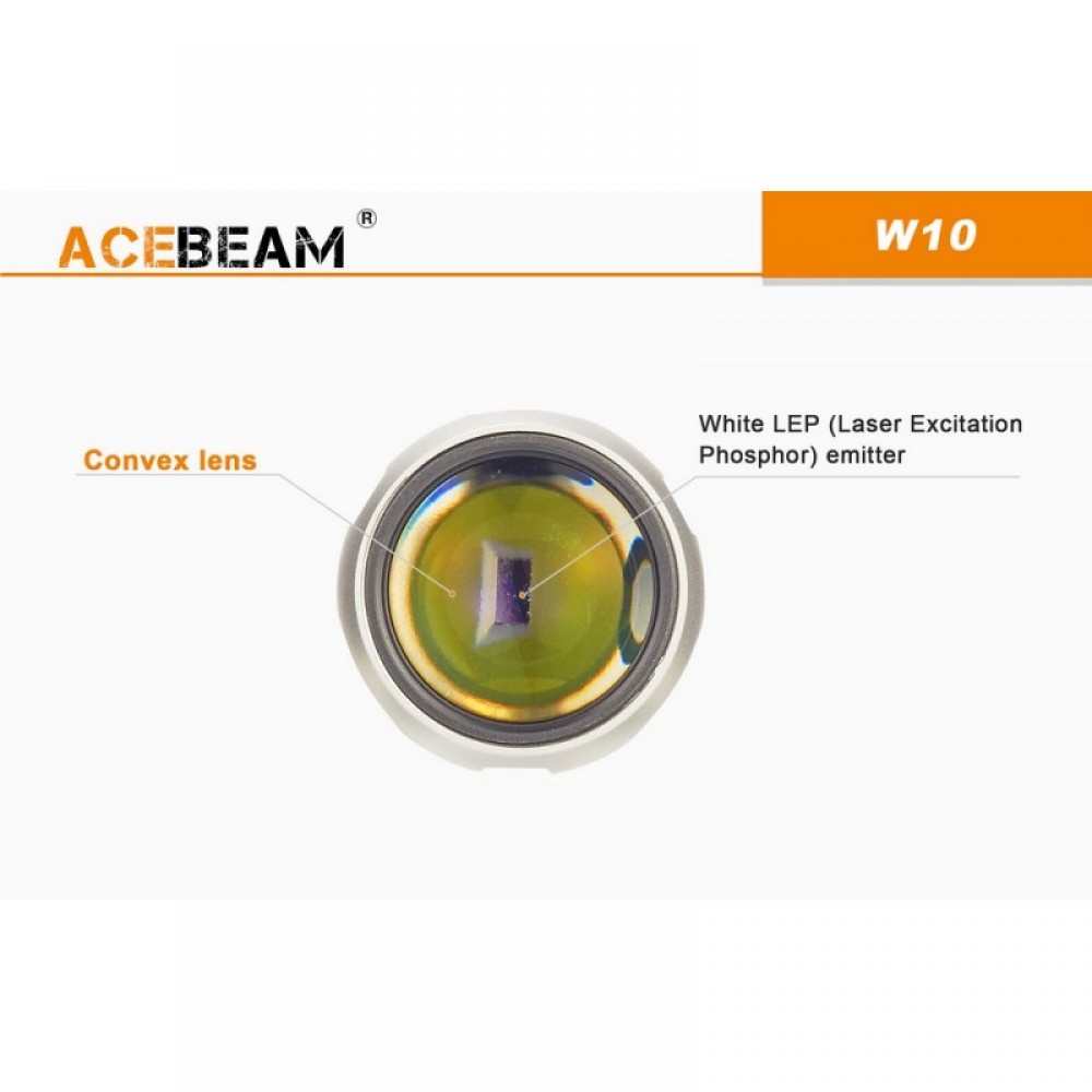 Фонарь лазерный белого света Acebeam W10 Throw дальность светового потока 1000 метров с цветовой температурой 6500 K-9500 K в котором полностью отсутствует ИК и УФ спектр. В комплект поставки входит высокоскоростное зарядное устройство от порта USB Type-C и Li-ion аккумулятор Acebeam 21700 емкостью 5100 мАч, который обеспечивает 3,3 часа работы в максимальном режиме.