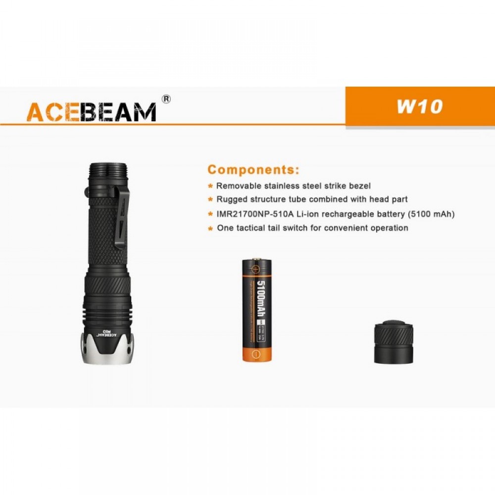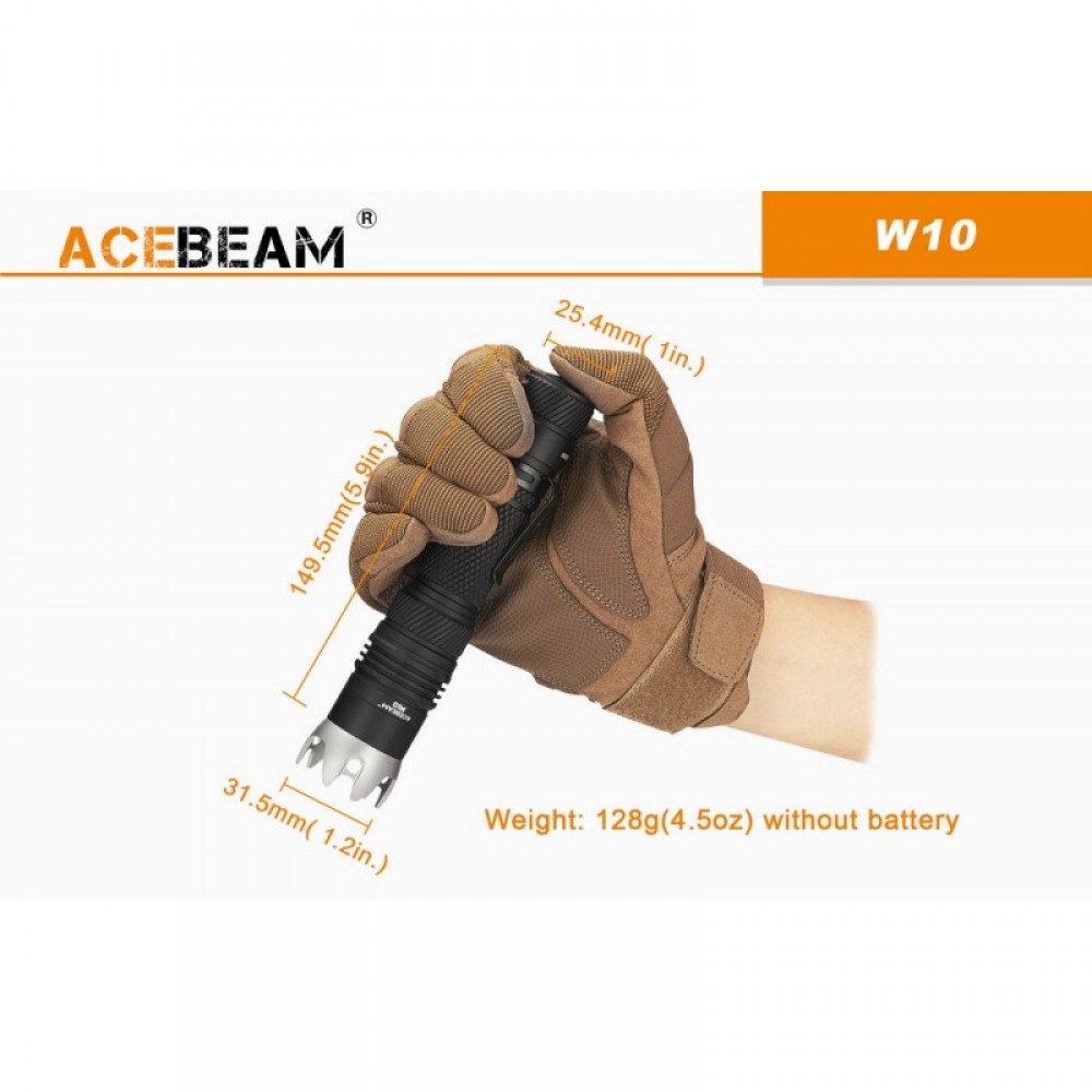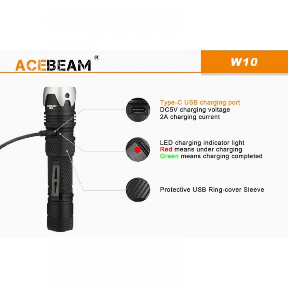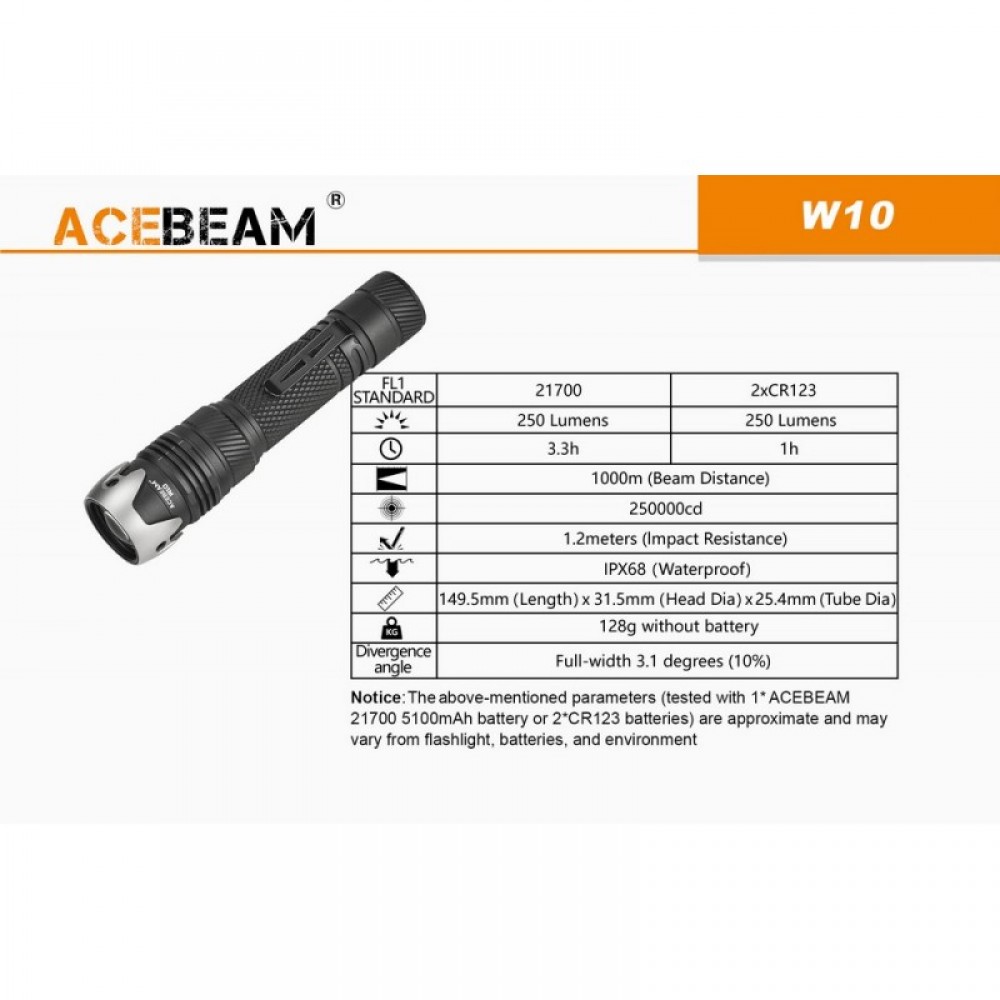Фонарь лазерный белого света Acebeam W10 Throw дальность светового потока 1000 метров с цветовой температурой 6500 K-9500 K в котором полностью отсутствует ИК и УФ спектр. В комплект поставки входит высокоскоростное зарядное устройство от порта USB Type-C и Li-ion аккумулятор Acebeam 21700 емкостью 5100 мАч, который обеспечивает 3,3 часа работы в максимальном режиме.