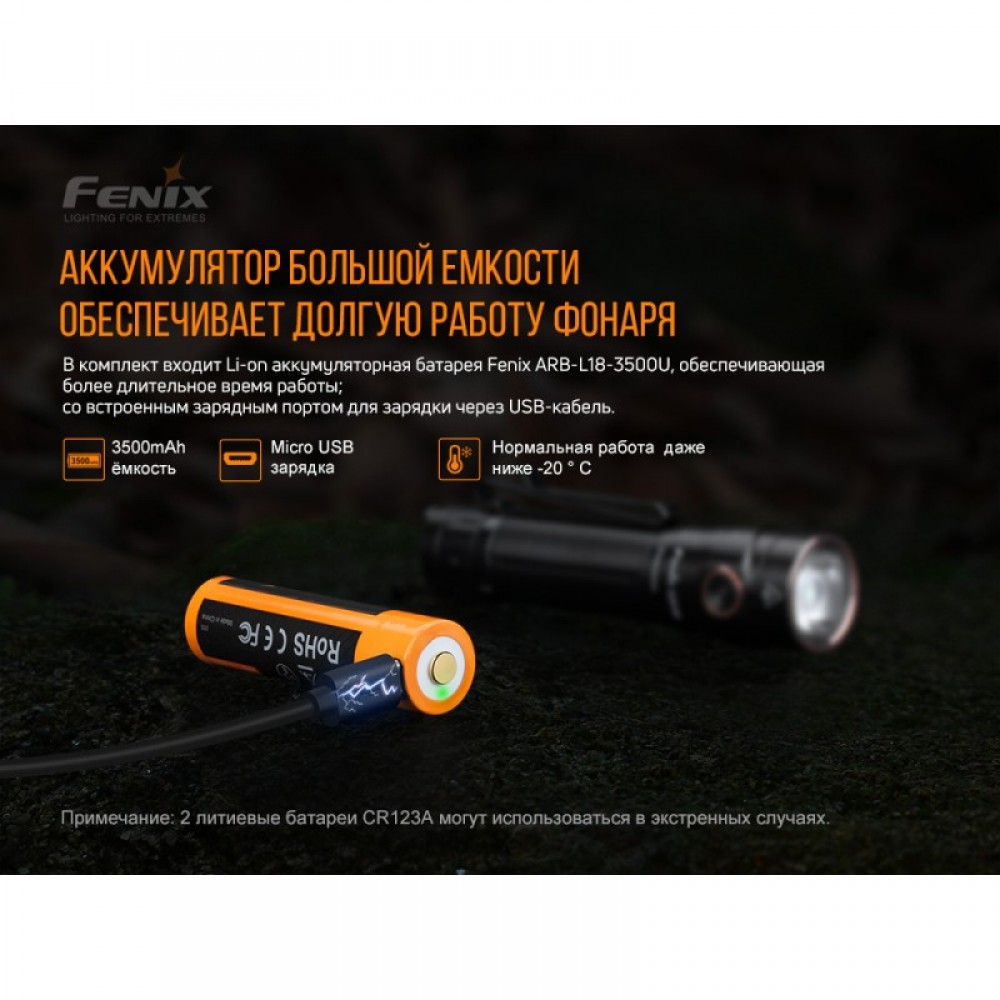 Устройство продается в комплекте с аккумулятором. Питание осуществляется за счет наличия литий-ионного аккумулятора 18650, емкость которого составляет 3500 миллиампер-часов. Доступна зарядка с помощью Micro USB. Батарея способна выдержать даже низкую температуру вплоть до 20 градусов Цельсия. Это гарантирует бесперебойное и стабильное функционирование фонаря в сложных погодных условиях.