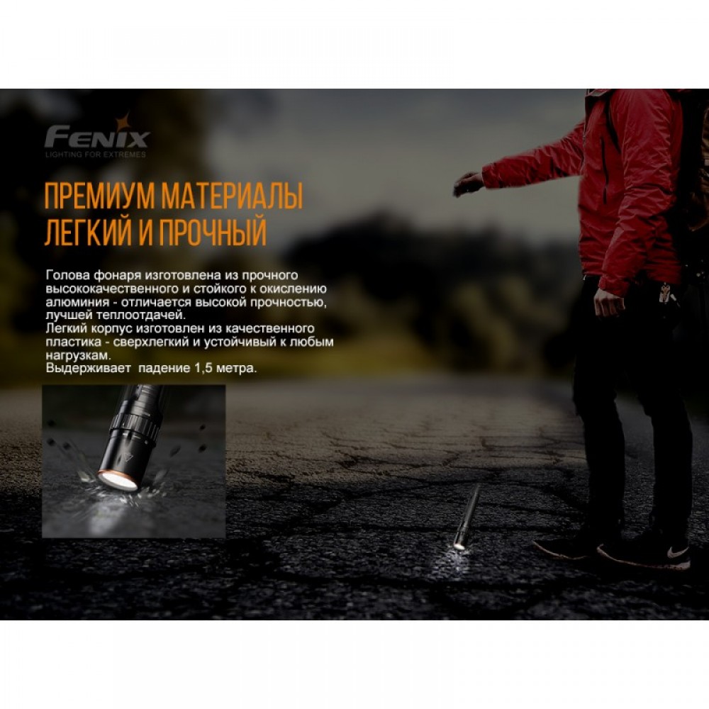 Оболочка модели Fenix LD42 изготовлена из двух разных материалов. Для деталей головной части используется алюминий с большим запасом прочности, который надежно защищает все основные механизмы фонаря. Батарейный отсек сделан из легкого пластика, благодаря чему общий вес фонаря без элементов питания составляет только 100 г. Как и у многих других фонарей Fenix, корпус Fenix LD42 сделан полностью водонепроницаемым и соответствует всем требованиям международного стандарта IP-68.