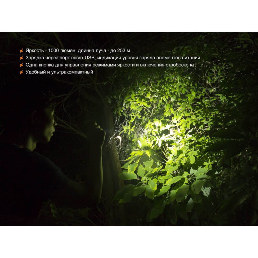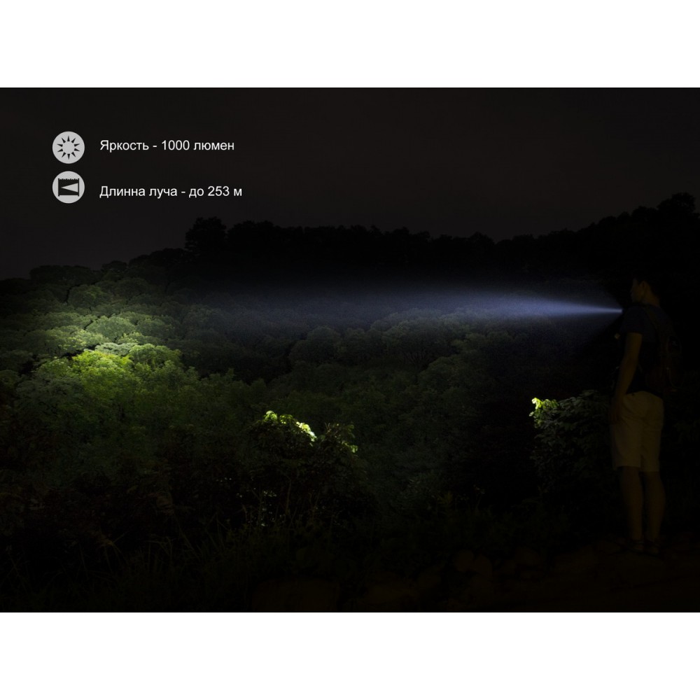 - яркость Turbo: луч на 1000 люмен, общая продолжительность работы 1 час 25 минут с дистанцией освещения, равной 253 метра