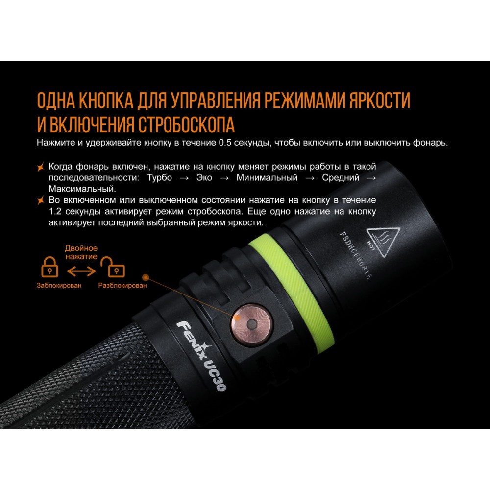 Fenix UC302017 работает на основе качественного диода Сree одного из последних поколений - XP-L HI V3. Этот диод дает 1000 люмен света и возможность использовать 6 различных режимов. В распоряжении владельца фонаря 5 уровней яркости и еще один дополнительный режим, который поможет подавать хорошо видные световые сигналы даже на большое расстояние.