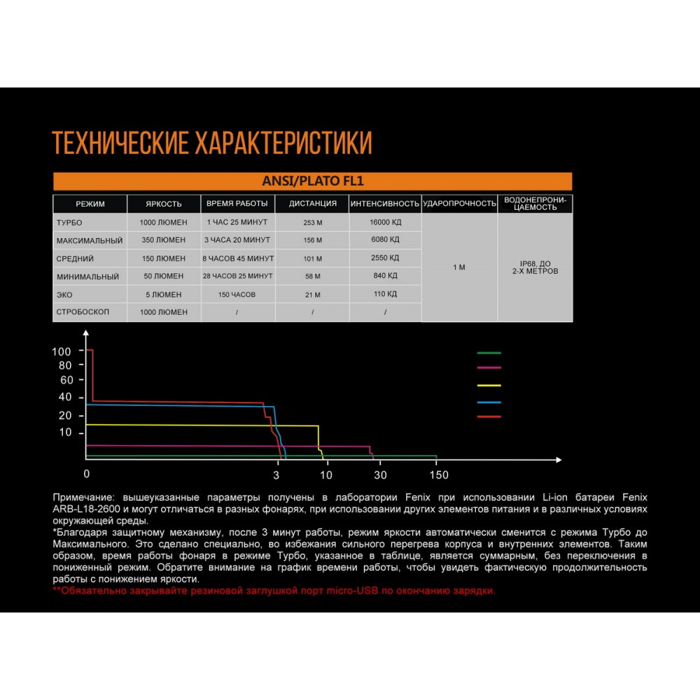 - 1000 люмен - 1 час 25 минут - 253м
