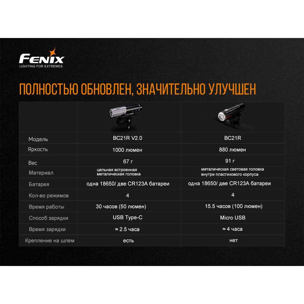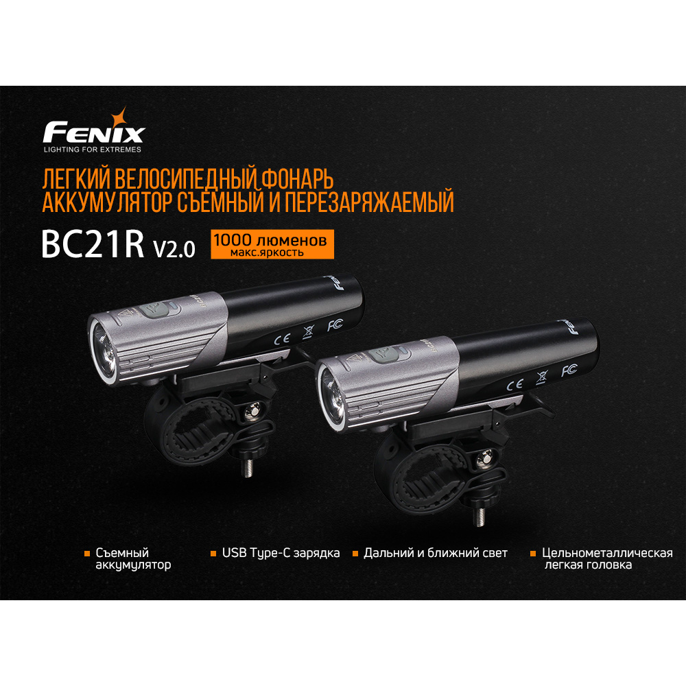 Fenix BC21R V2.0 – это новая велосипедная фара известного китайского производителя. Модель получила усовершенствование относительно прежней версии BC21R. В частности, увеличился показатель светового потока фонаря. Яркость новинки достигает 1000 люмен против 880 люмен предыдущей версии. Также снизился вес изделия. Если велофара BC21R весила чуть более 90 грамм, то нынешняя модель весит 67 грамм. Кроме того, BC21R V2.0 может похвастаться цельной металлической основой. А еще он поддерживает зарядку посредством USB Type C. Наконец, новинка заряжается в течение двух с половиной часов, в то время как у прежней модели на это уходило четыре часа.