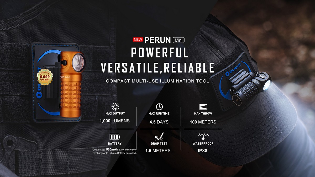 Инженеры Olight всегда отличались способностью создавать пионерские решения, быть первыми. Не исключением стал и выход фонаря Olight Perun mini. Фонарь кроме привычной налоголовной ленты имеет крепление с ответной частью на систему Велкро. Данное решение заинтересует большое количество людей, предпочитающих одежду в стиле милитари. Возможность закрепить фонарь как налобный, на кепку, на рукав куртки для использования по своему непосредственному назначению, для освещения. Так же возможно зафиксировать фонарь на рюкзак или шлем, в качестве маячка.